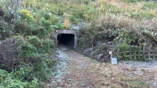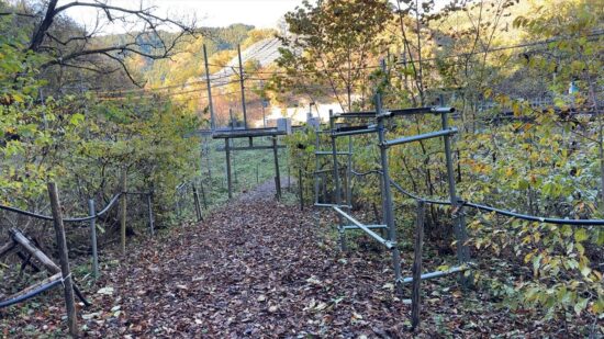 最後の細く、滑りやすい登山道を下ります。パイプは氷柱を製作するため?