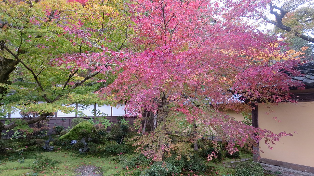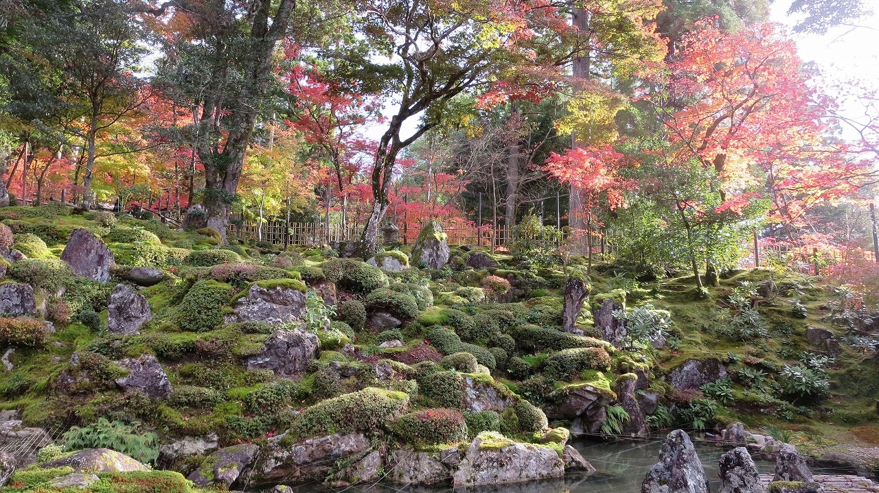 紅葉の赤・黄色と苔の緑のコラボも素晴らしい