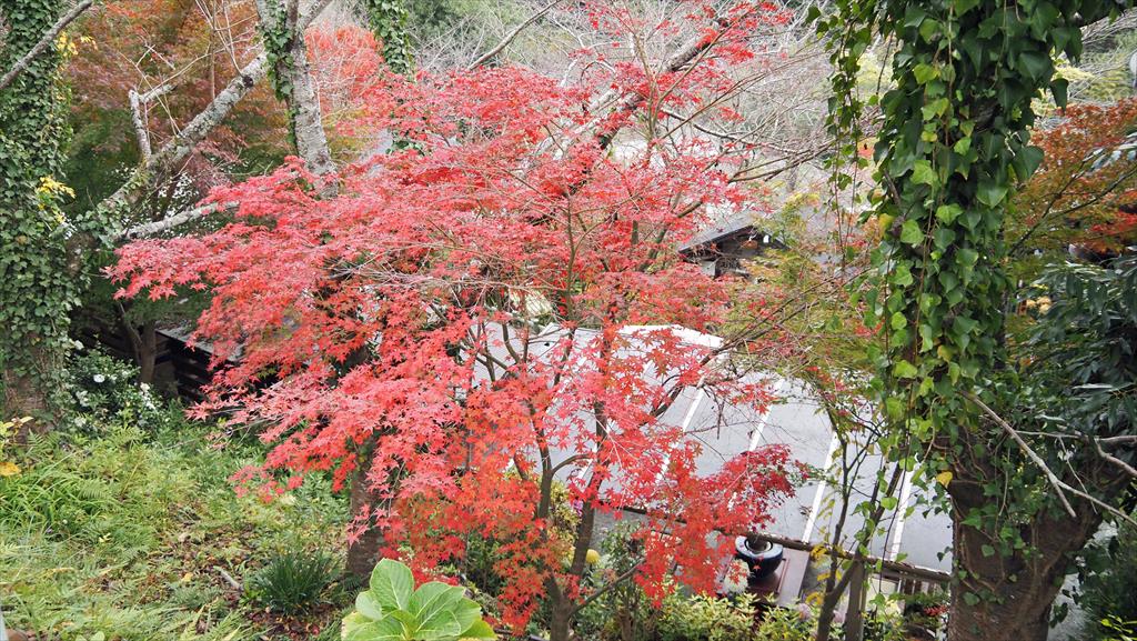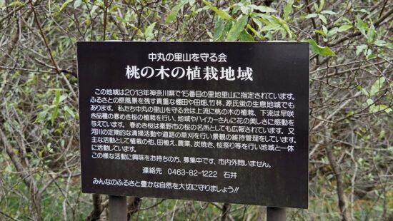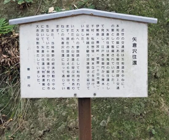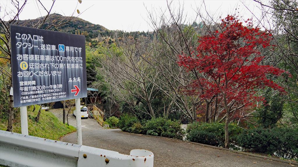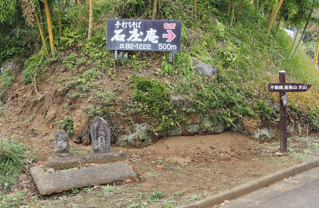 道の脇に野仏。手打ちそば「石庄庵」の案内板が出ていた。全国約4万軒のそば店の中で、つねにベスト100店に選ばれる神奈川を代表する手打ち蕎麦店です。春は桜と眩しい新緑、夏はホタルと木立が涼しげ、秋は蕎麦の花と紅葉、冬は小雪がちらつき何とも言えない情緒を醸し出す、田舎の隠れ蕎麦店です。