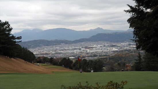 ゴルフ場・東京CC(東京カントリー倶楽部)を見下ろす。遠くの山並みは箱根外輪山の山。