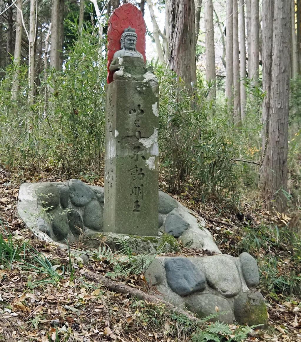 不動明王像の上部と古い石塔が接合されている。以前は道標の役割があったと言われています。