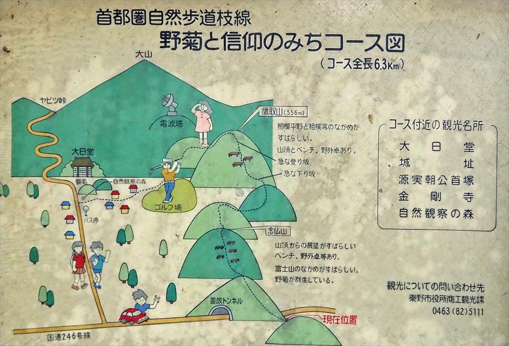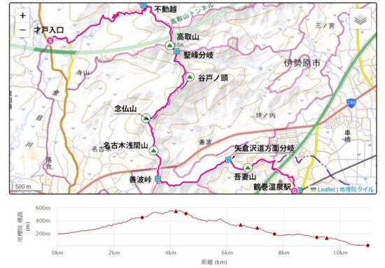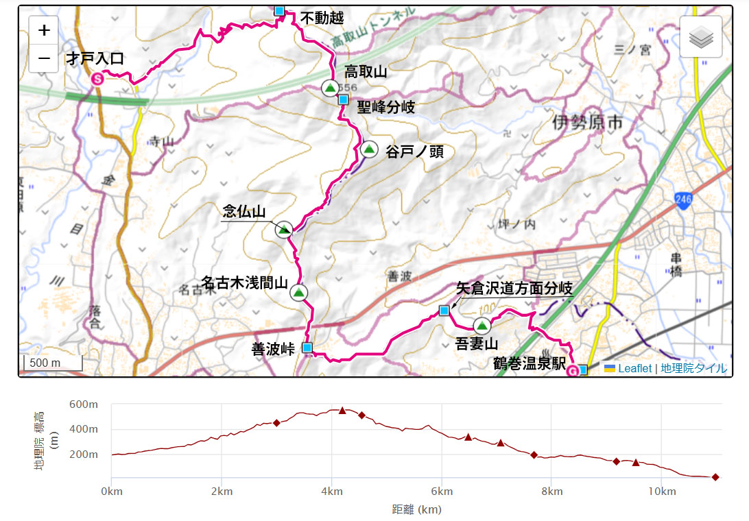 小田急線秦野駅=才戸入口バス停10:08→11::00不動越(イヨリ峠)11:15→11:43高取山昼食含む)12:21→12:27聖峰分岐12:35→念仏山13:29→名古木浅間山13:43→善波峠13:54→矢倉沢道方面分岐→吾妻山14:46→15:13鶴巻温泉駅
