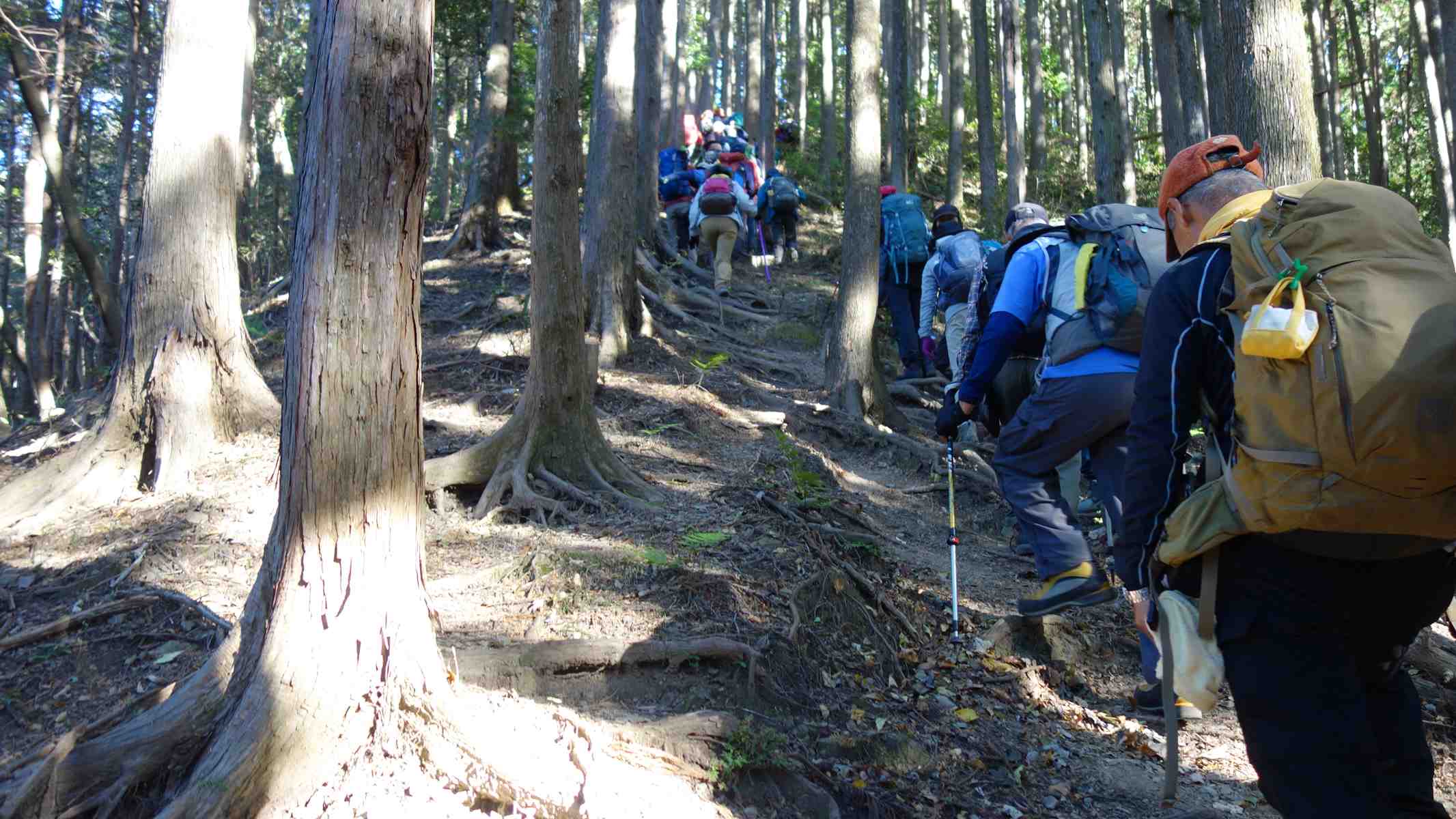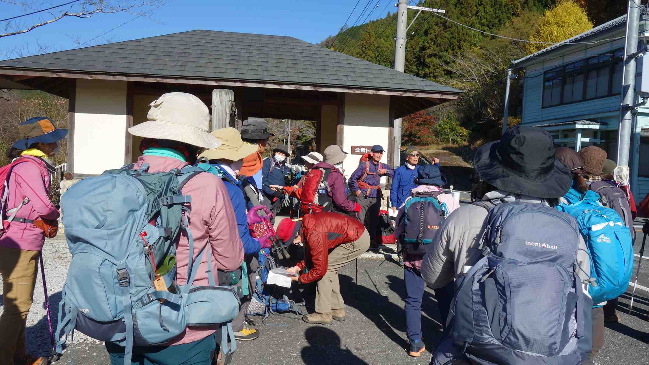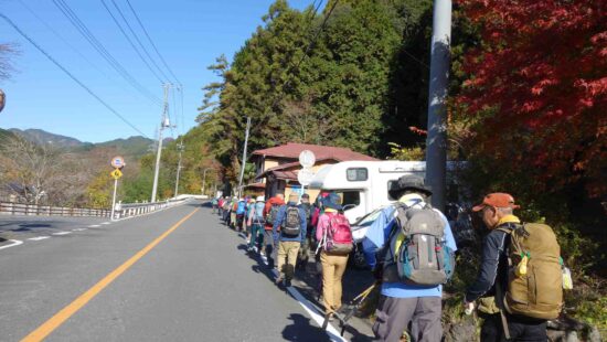 風の冷たい寒い朝でしたが、雲一つない青空の絶好のハイキング日和でした。名郷行のバスは、ハイキング客で超満員の寿司詰状態。乗り降りに時間がかかり20分程の遅れが出るも無事、小殿到着。