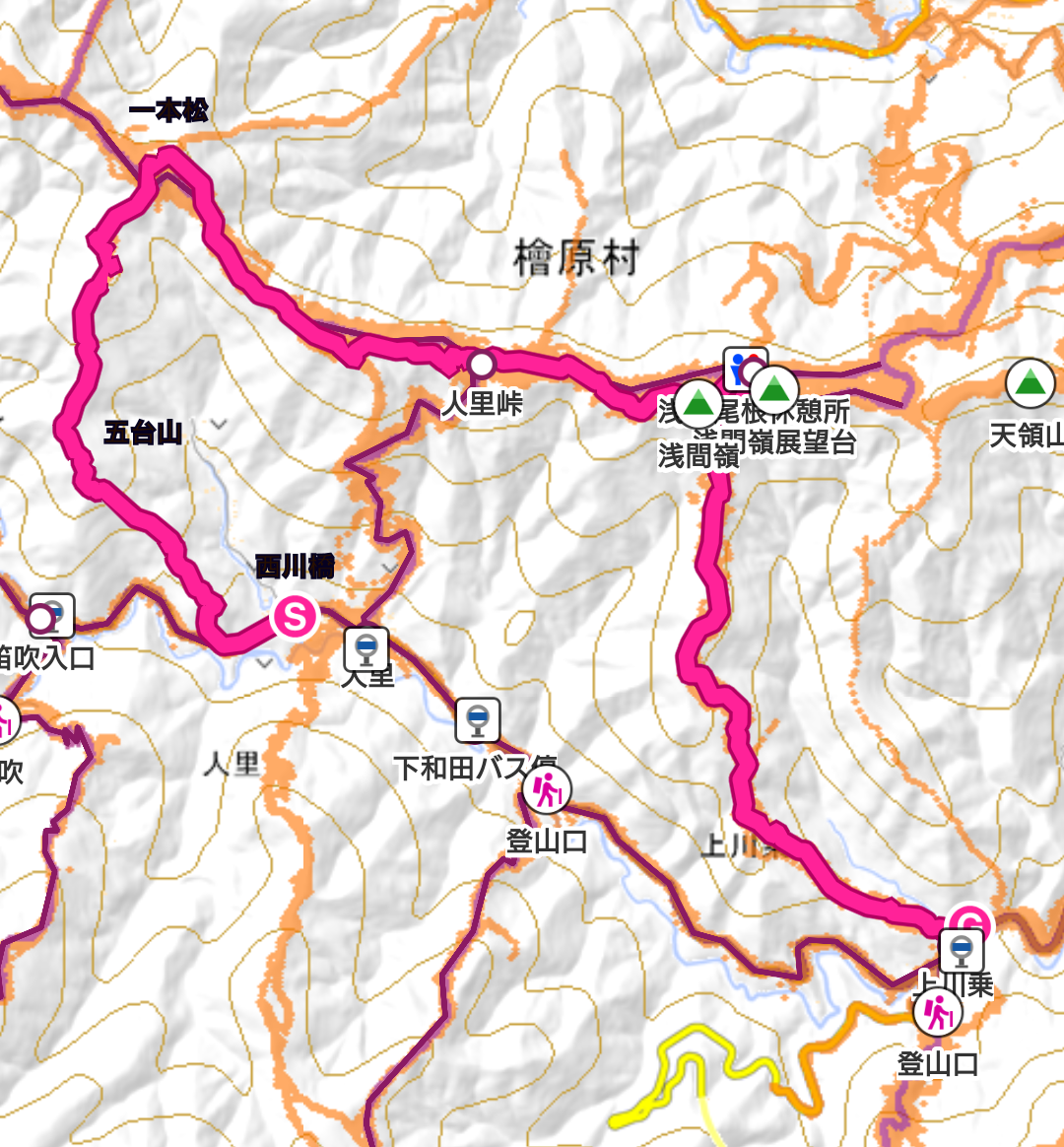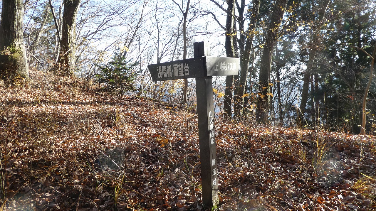13:44浅間尾根休憩所13:55ー13:57浅間嶺展望台14:04ー15:02上川乗バス停