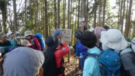「私の所には色々なモンスターの参加が多い。若い人達に負けぬように必死で歩くのだと言われるのだが、その中のお一人が目標にしていた≪年間100回の山≫を達成した。去年急に“100回!”と言い出して、その年は100回手前で失敗したため、今年は夏の少なさを見込んで、1月から意識的に歩いたらしい。日帰りも泊りもイチと数えるのは難しいが、そうして積み重ねた数字が昨日で103回目。その話を前日耳にされたある先輩会員さんがレイと手作りのカードを持参されたと聞いて、陽がいっぱいの石宮ノ頭でみんなと写真を撮ることになった。