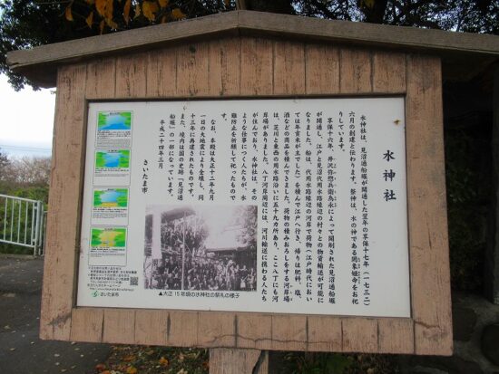 水神社は、見沼通船堀が開通した翌年1732年に創建。御祭神は水の神様である罔象姫命(ミヅハノメ)。