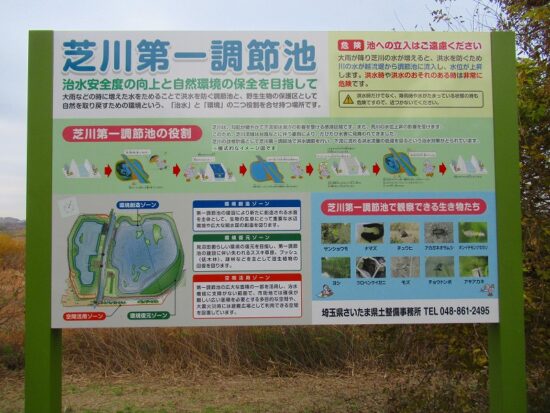 12:00 調整池:洪水を防ぐ調整池と野生生物の保護区として二つの役割を持った場所です。