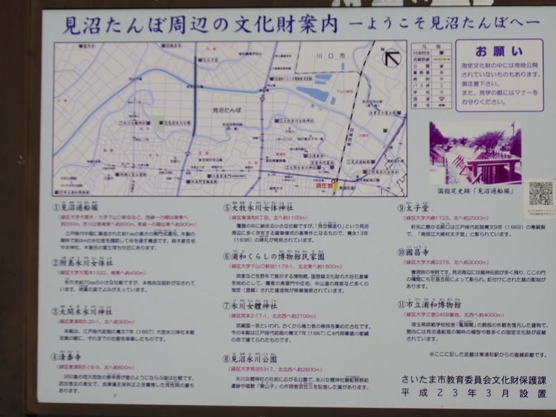 ◆コース :JR武蔵野線東浦和駅10時集合 歩行開始10:15→見沼通船堀公園10:25→見沼通船堀西縁→鈴木家住宅10:45→見沼通船堀東縁→木曾呂の富士塚11:30→川口自然公園12:10(昼食)12:50→見沼自然の家13:10→園芸植物園13:40→大崎公園14:00→念仏橋バス停14:40解散