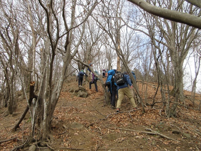 コメント:時間がたって忘れてました、下見後ザレ場の急登が続き会山行には不向きかなと思ったこと、加えて経ヶ岳からの一般路も落葉沢山で滑りやすく冷や汗をかきました。参加リーダーと参加者に励まされて完踏できました、参加者皆様のお陰、感謝です。