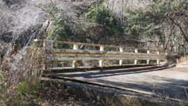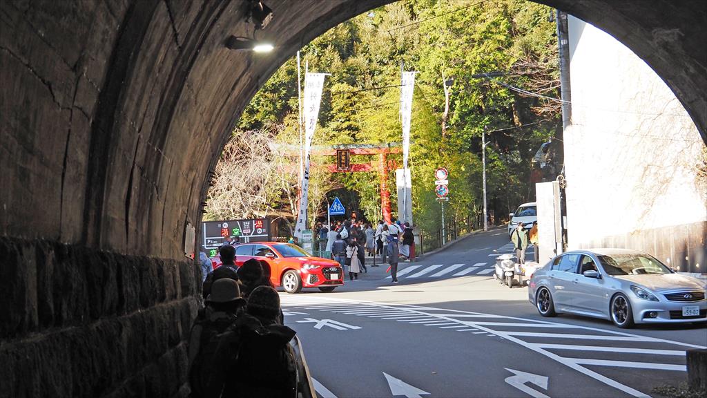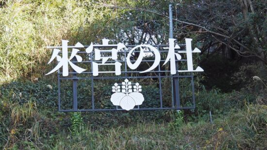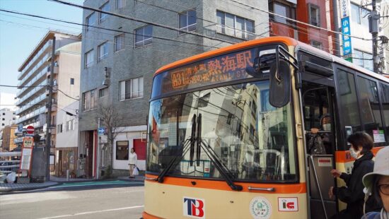 清水町バス停から急坂を上ると、JR伊東線に突き当たる。線路に沿って右折。同線のガードを左折。正面に来宮神社がある。