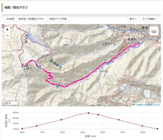 上記は玄岳ハイキングコースの軌跡及び標高グラフ。往、復路同じ。