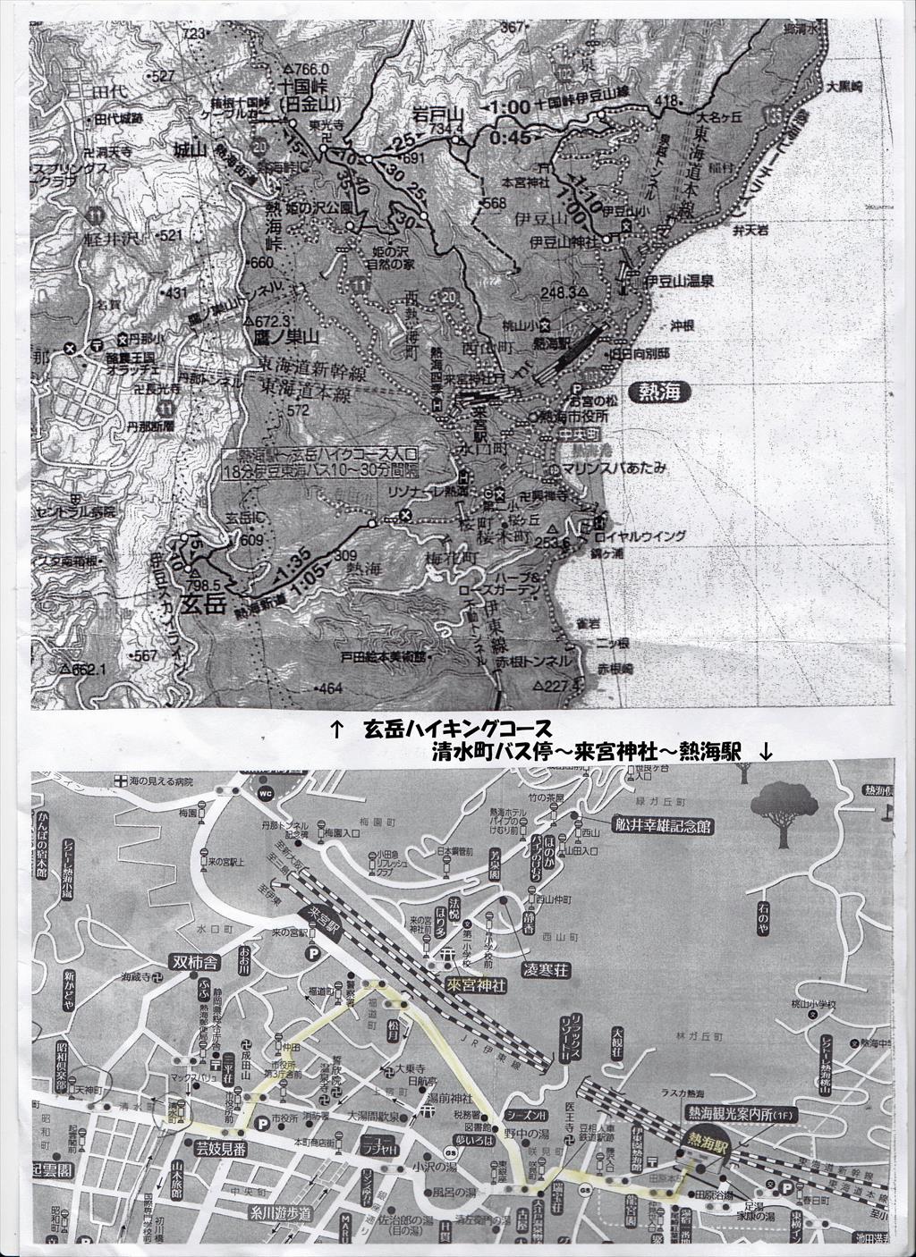→熱海新道陸橋13:16→玄岳登山駐車場13:46→玄岳ハイクコース入口14:00=清水町バス停14:25→14:40来宮神社15:00→15:20JR熱海駅