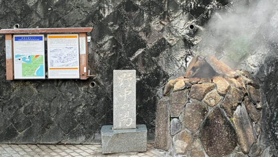 しばらく歩くと、ビルの前で湯煙があがっていた。「野中の湯」と彫られた標示石が置かれていた。「熱海七湯」の源泉の一つです。