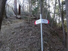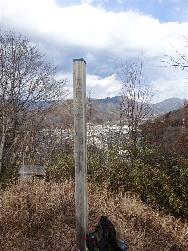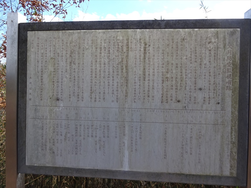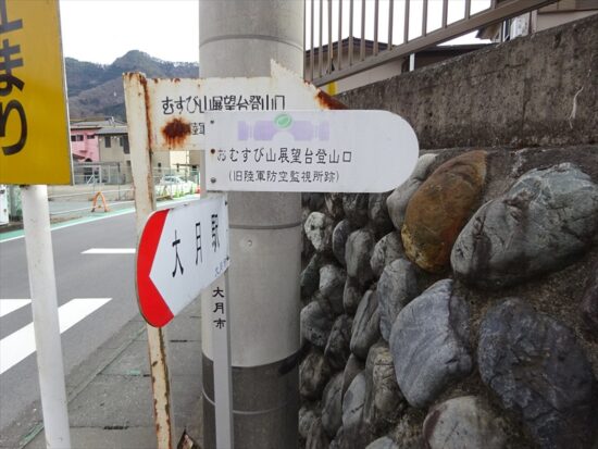 むすび山に到着です、大月防空監視哨跡の木製の名碑と説明文の看板があります。