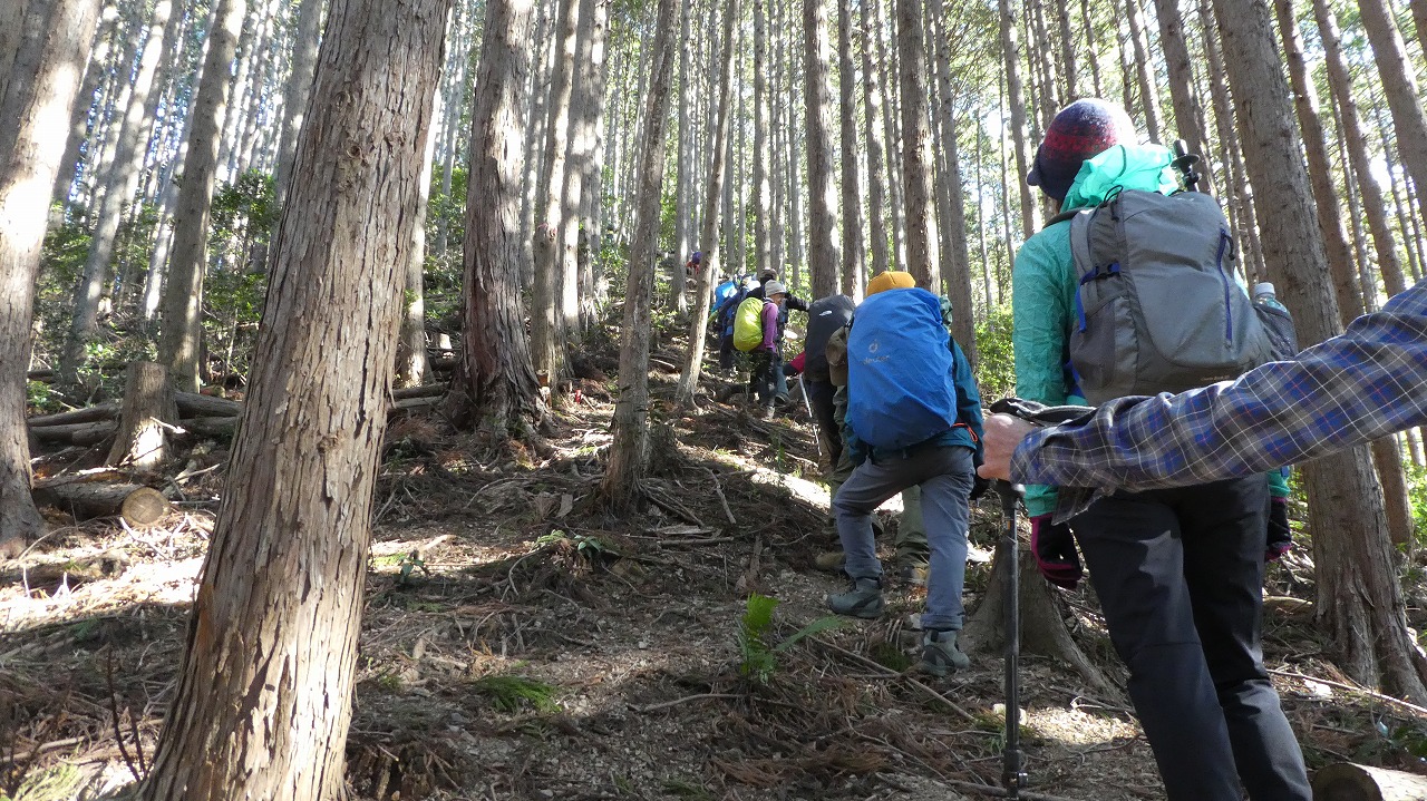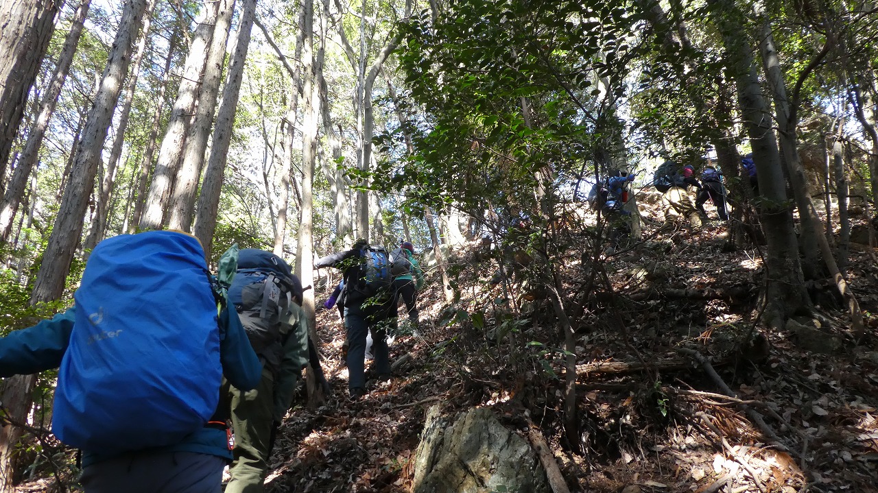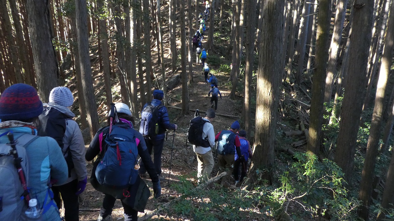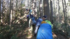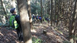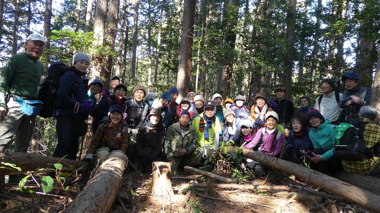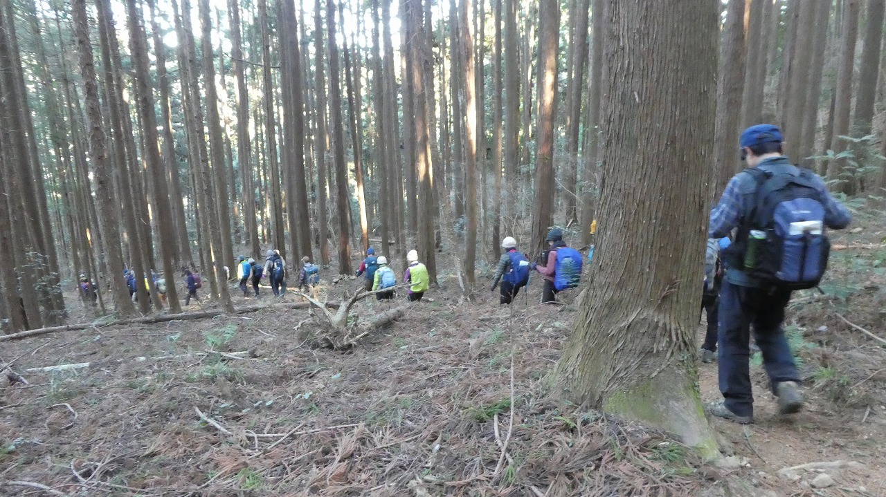 「人の出入りが少ないルートは薮を警戒して冬場が勝負である。人里に近い奥武蔵では自然林伐採後の杉ばかりで、陽が届かず暗くて寒いが、下草の茂りがない分、山中の踏跡はしっかりとしていて歩き易くなっている。この時期に陽はいっぱいで温かく、でも踏跡もキッパリ!を望むのは大きな贅沢?ベテラン会員さんのお力を頂きながら想定したルートを歩き通し、法光寺の墓苑に下山した。