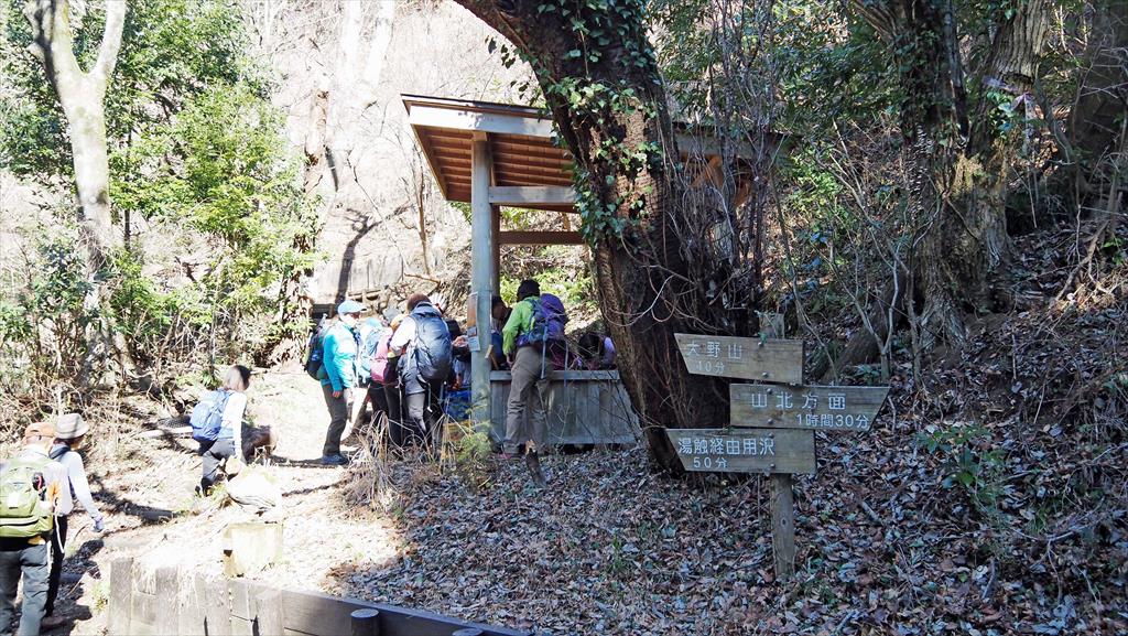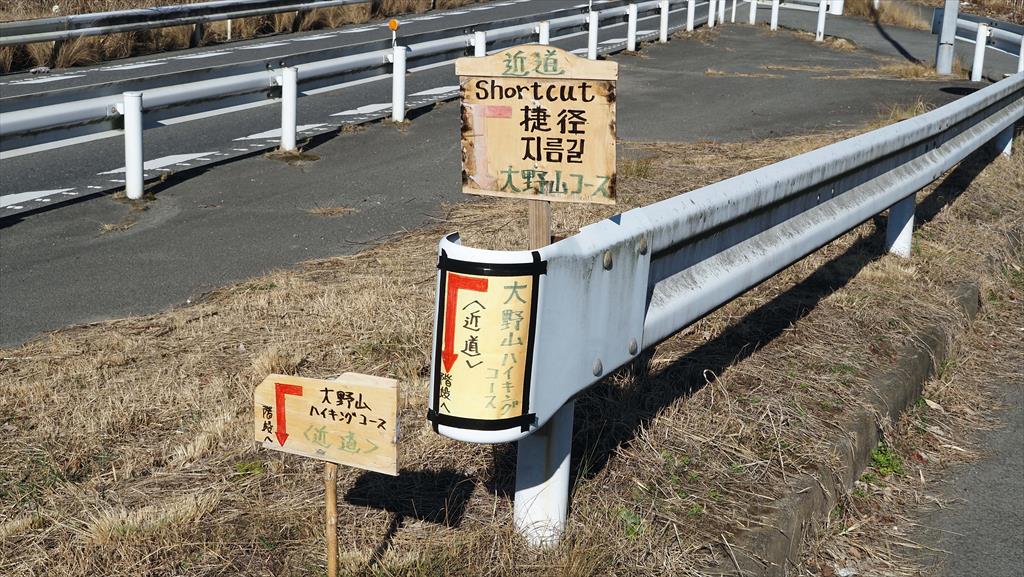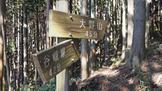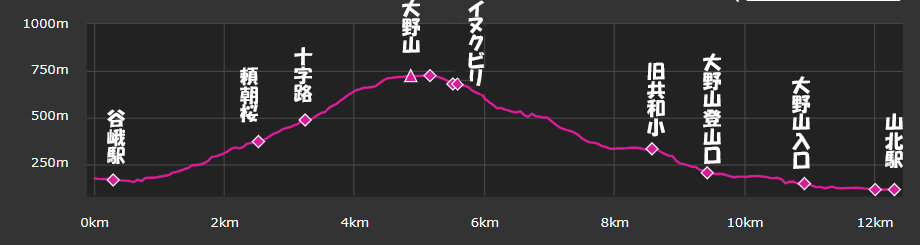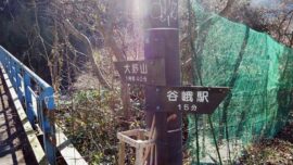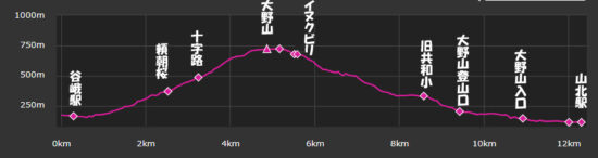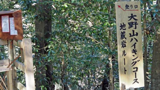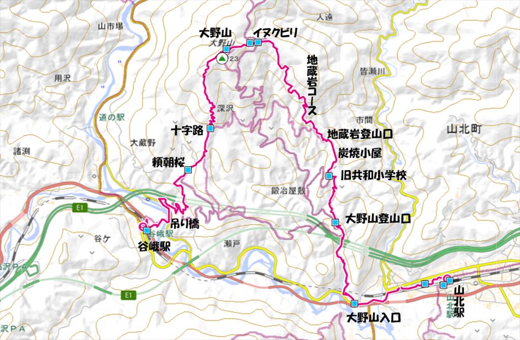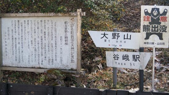 JR御殿場線谷峨駅9:30→嵐橋(青い吊り橋)9:43→都夫良野頼朝桜10:20→11:40大野山(昼食)12:30→イヌクビリ12:37→地蔵岩ルート→大野山登山口14:10→大野山入口14:35→JR山北駅14:50