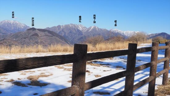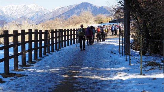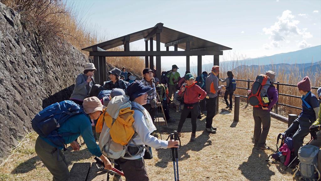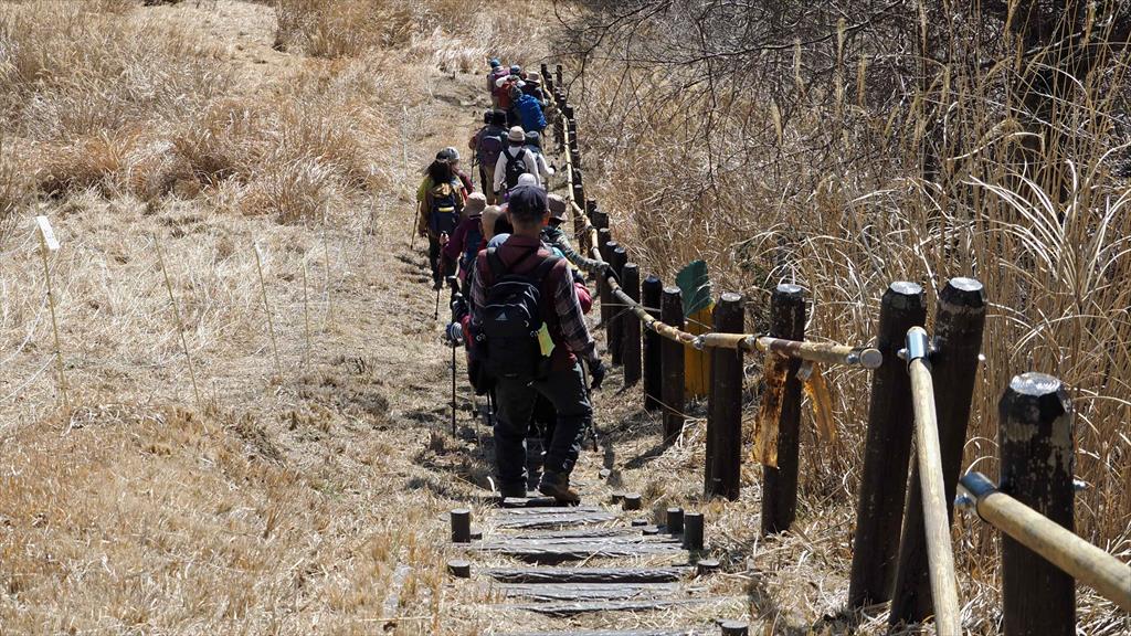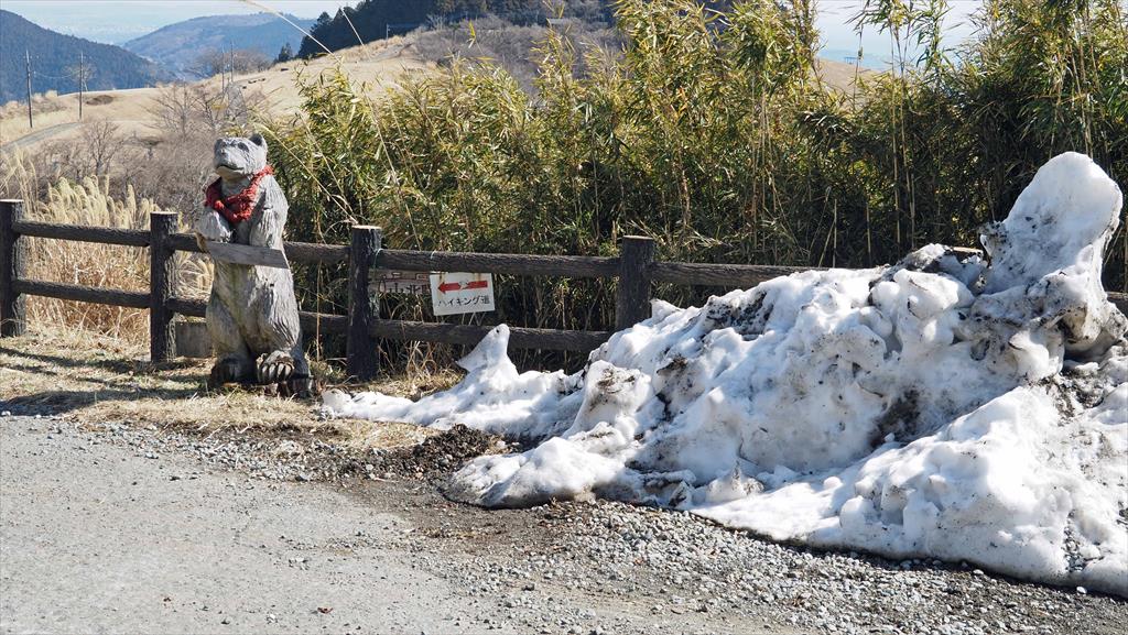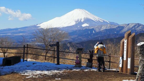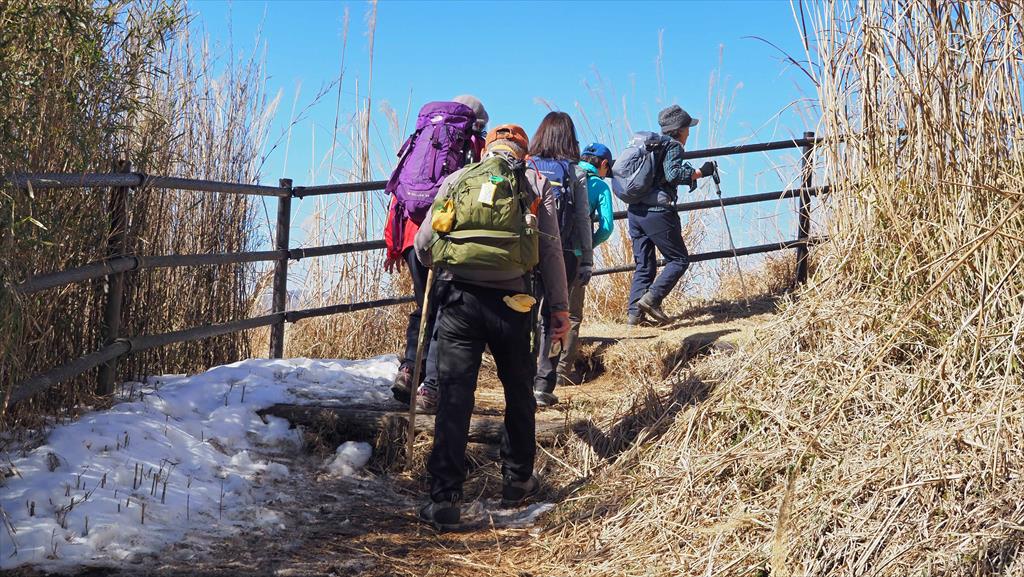 高度が上ると富士山が眼下にみえ隠れ、ビューポイントで休憩を兼ねて写真タイム絶景を楽しむ。樹林がきれ、一面がカヤトのエリアにジクザグと整備されたみちを進むと頂上直下に、この辺りは陽が差さないのか残雪あり。アイゼンを付ける程ではなかったので、雪の感触を楽しむ。