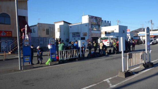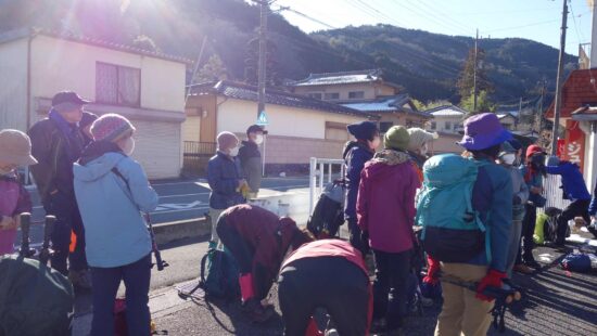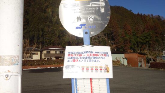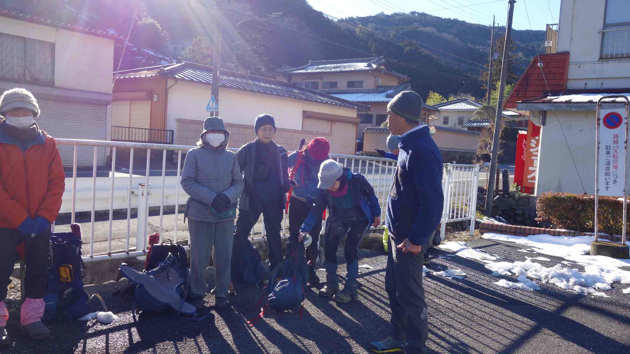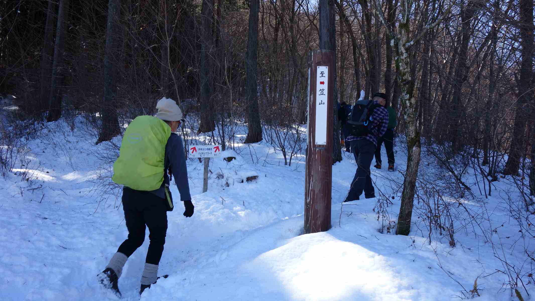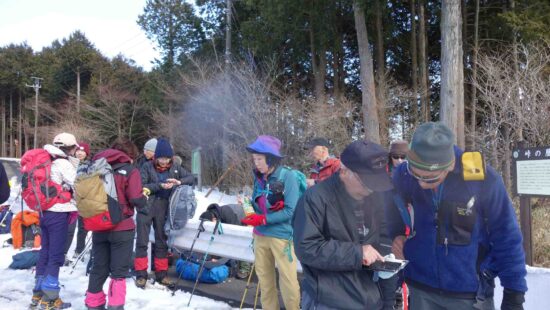小川駅に着き、白石車庫行バス停で先着した会員さんよりバスは終点まで行かず皆谷止まりと知らされ、バスの運行状況を確認するべきと反省・・・・山行計画するときにエスケイプルートも考えていたのでコース変更の旨伝え山行開始する。皆谷バス停付近には積雪少なく萩平T字路で水分補給と衣類調整をする。高度を上げるにつれ積雪が増し、萩平・笠山林道に出たとこで安全の為アイゼンを装着する。