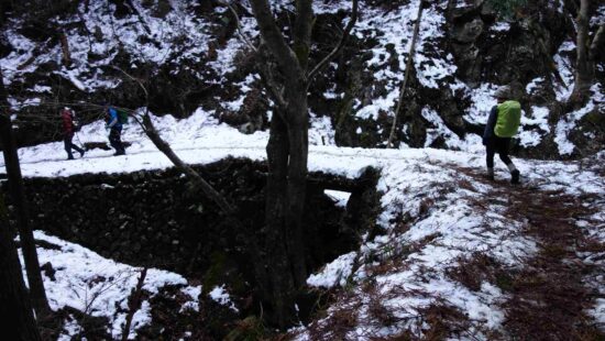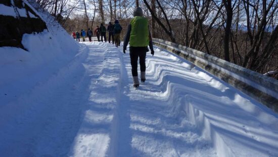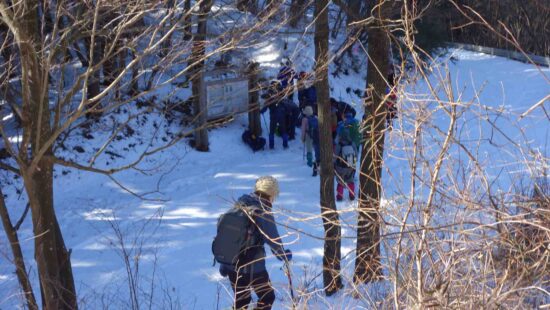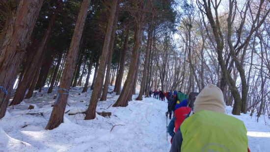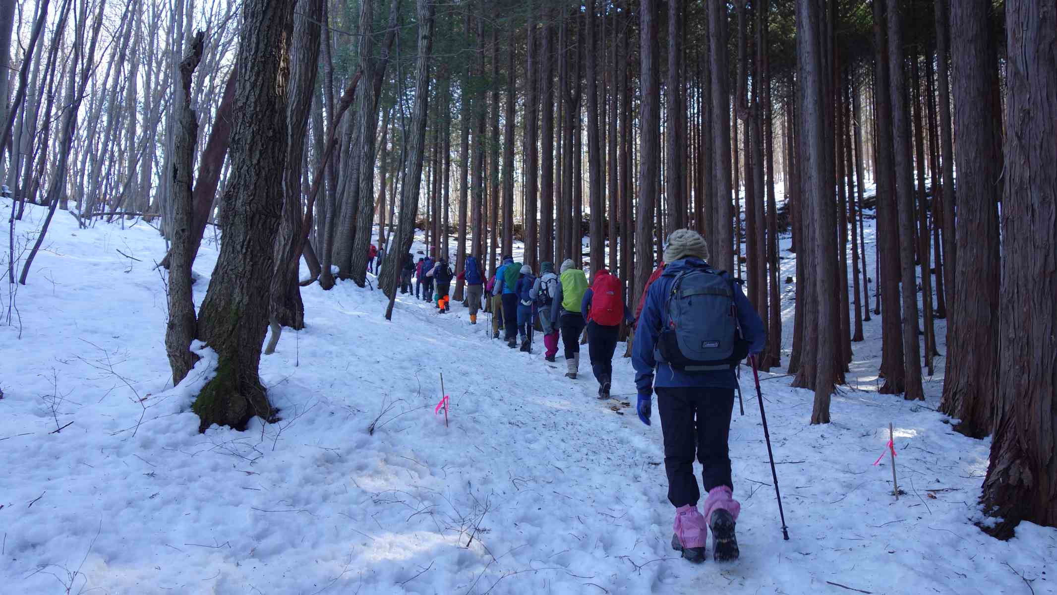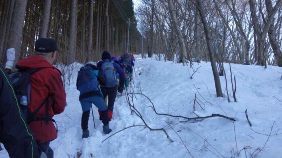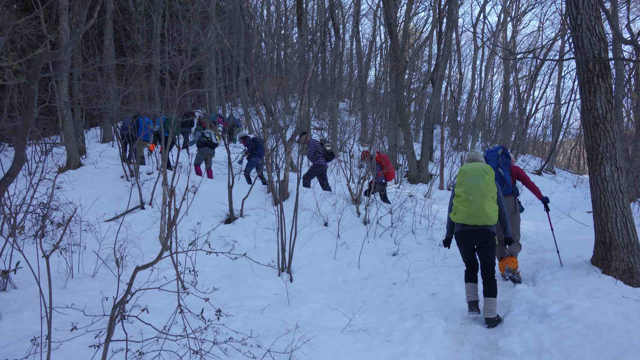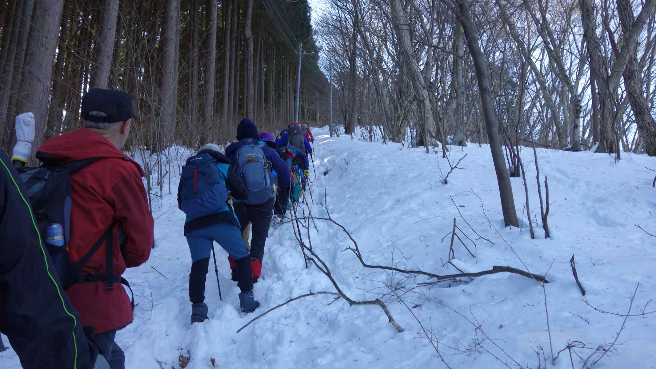 堂平山への登り、積雪は益々多くなってきました。雪国育ちの方はアイゼン無し、ストック無し