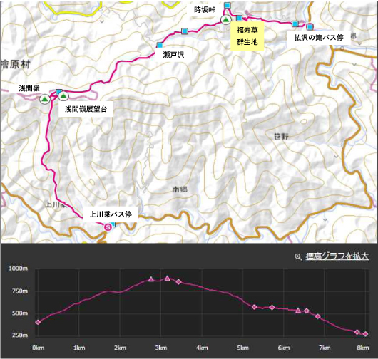 ▼コース : 上川乗バス停09:50 – 11:20 浅間嶺展望台 – 11:30 浅間尾根休憩所(昼食) – 11:56 浅間嶺山頂 – 12:10 浅間尾根休憩所 – 12:50 瀬戸沢 – 13:03 小沢バス停分岐 – 13:17 時坂峠 - 13:46 払沢の駐車場 – 13:55 払沢の滝入口バス停