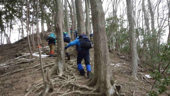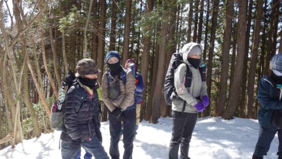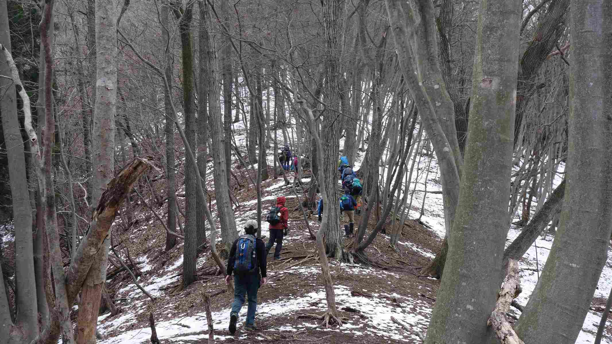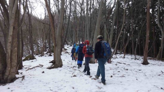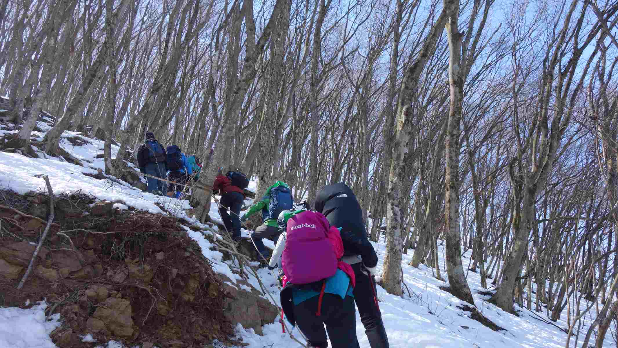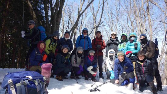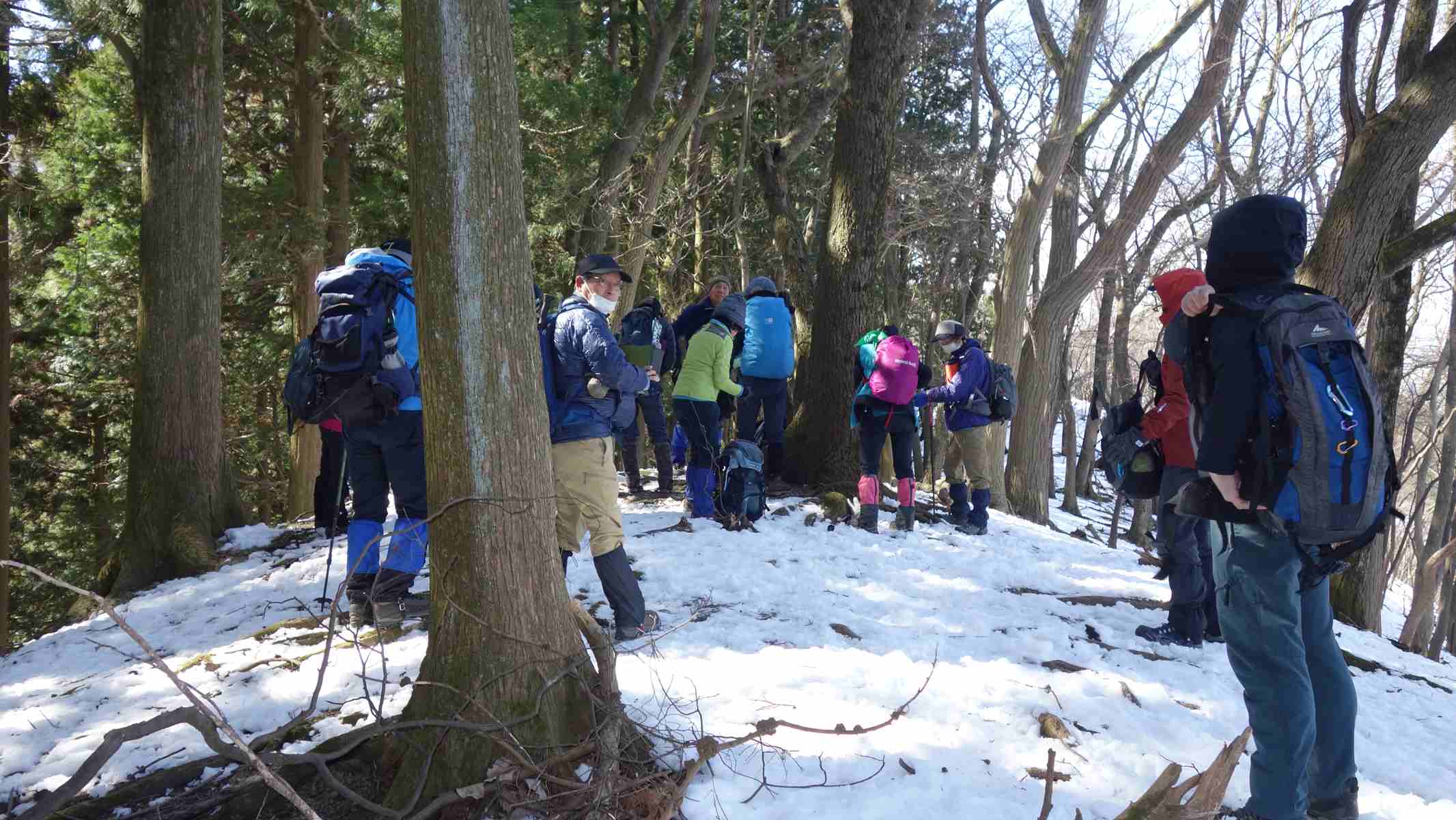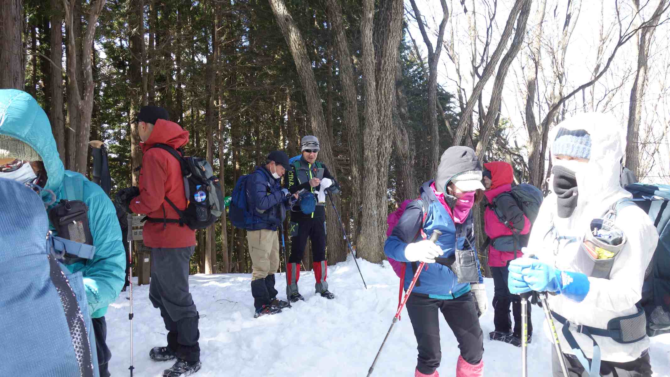 集合場所の芦ヶ久保駅には、18名もの健脚自慢の方々がそろっており、挨拶とコース説明後、天気も良く風も穏かな中元気にスタートする。岩菅山につき尾根道に出ると冷たい北風に一気に体温を奪れ不安であった登山情報を思い出す。二子山山頂の手前でアイゼンを装着しロープのある急登を、皆元気に登るも北風益々強くなり、登山情報の説明をする。二子山から武川岳までは北向の尾根道であり風速14㎧の北風をまともに受けての3時間の歩行は、危険と判断し下山することにしました。健脚の皆さんには不完全燃焼な山行で終わった事お詫びいたします。自然の脅威には勝てない!!! 星 富士夫