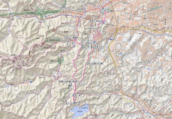 スタート地点~みころも公園(集合場所)~高尾天神社~初沢山~草戸山登山口~高泰寺台~拓大尾根305m峰~八方台~拓殖大西尾根分岐~草戸峠~草戸山~草戸峠~拓殖大西尾根分岐~四辻~高尾山口駅・ゴール