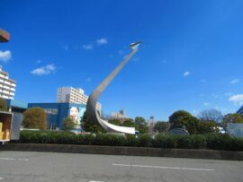 駅前に展示されている「YS-11」は戦後国内で初めての旅客機です。2006年まで国内線で大活躍しました。