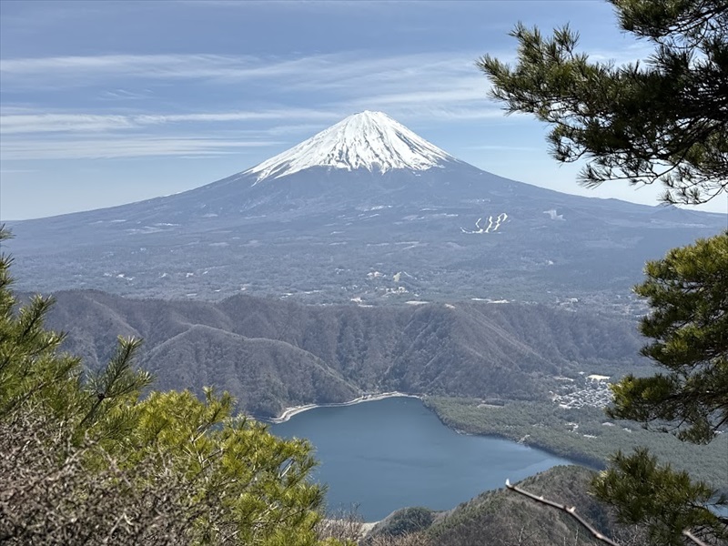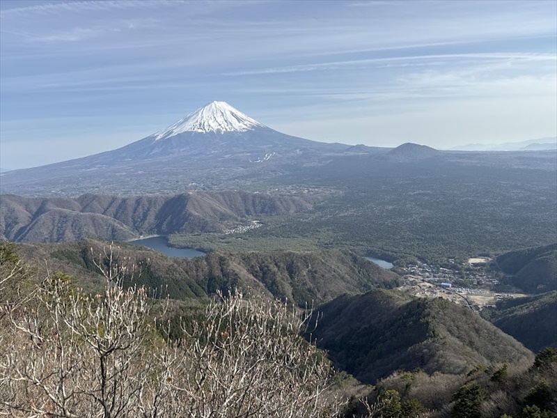 雪頭ヶ岳頂上手前の広場から観える富士山と西湖。素晴らしい光景に出逢えます。