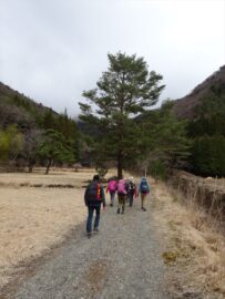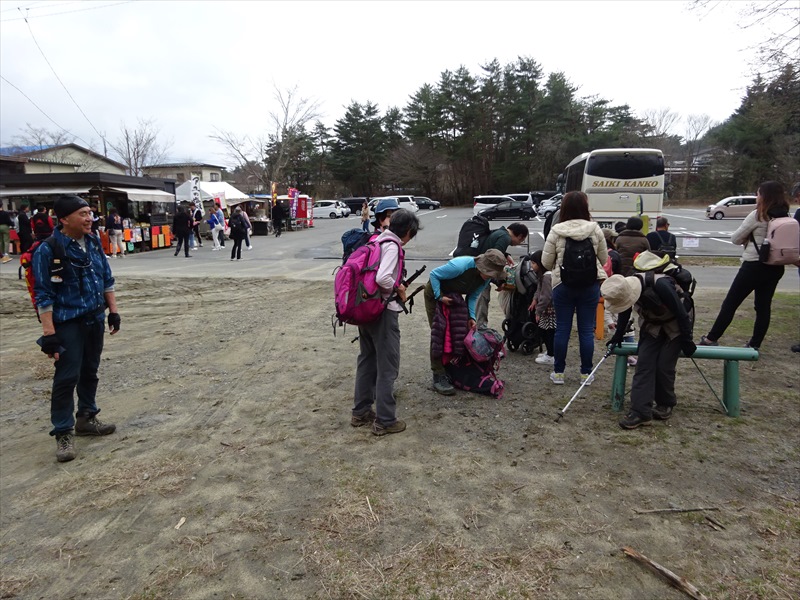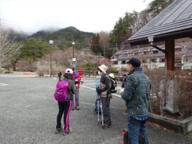 根場民宿バス停近くの駐車場。参加リーダーの紹介とコースの説明をしました。
