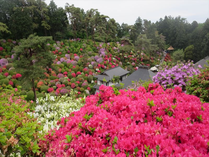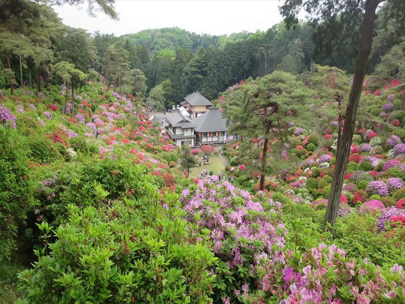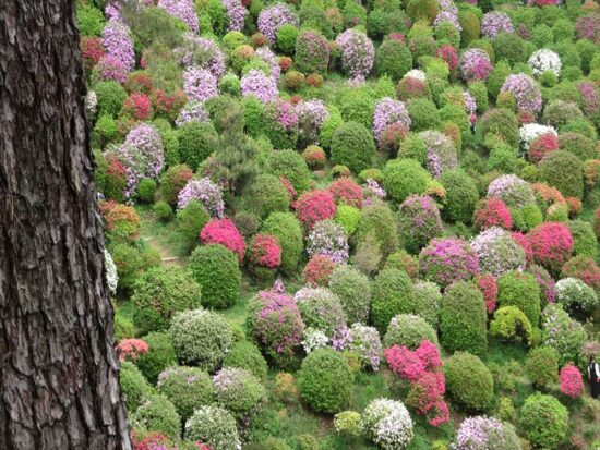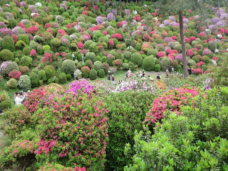裏側からの全景。すり鉢状の地形を生かした見事なつつじの植栽。
