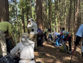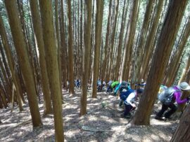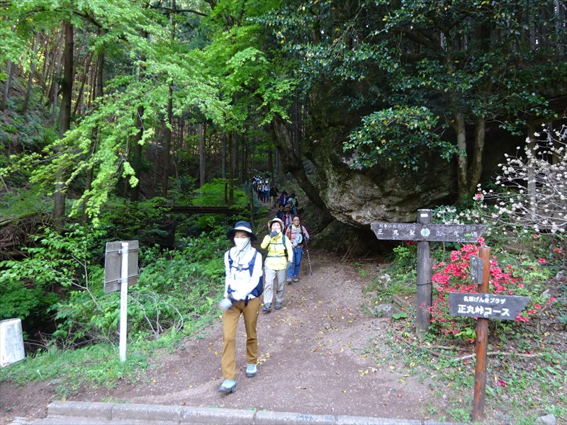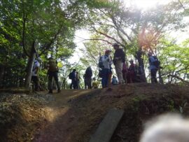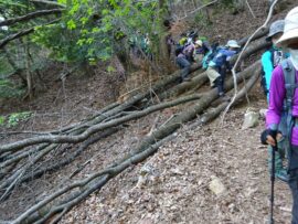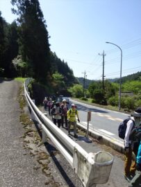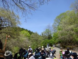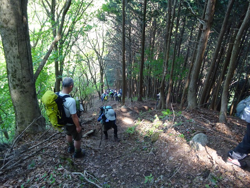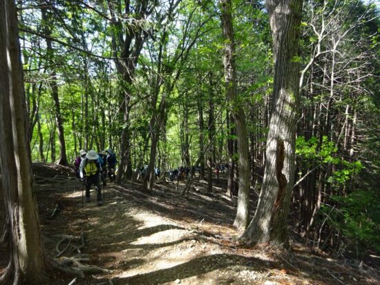 リーダーコメント:登山口から三田久保峠まで急坂を登り、尾根道に入ってからは急登とアップダウンが始まります。気温が高いとの天気予報も有りましたが山の中は柔らかい風も有り、新緑の中は思ったほど暑さは感じられませんでした。