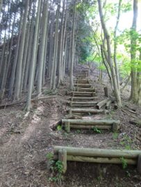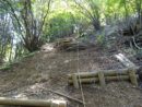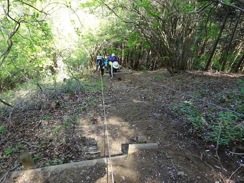 正丸峠に向かうと、長い階段が現れます、崩れているのでロープを頼りに登ります。
