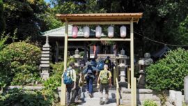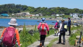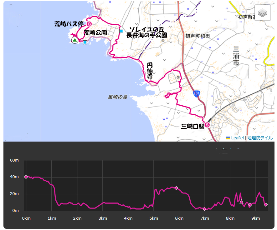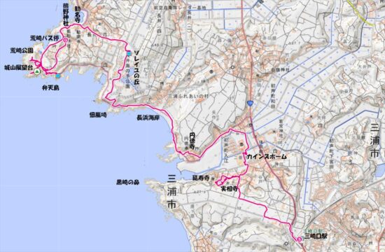 京急線三崎口駅9:14→10:25円徳寺→10:33長浜海岸→11:15ソレイユの丘(長井海の手公園)11:30→11:50熊野神社→12:05憩いの広場(昼食)12:50→夕日の丘13:00→弁天島→13:56荒崎バス停=三崎口駅
