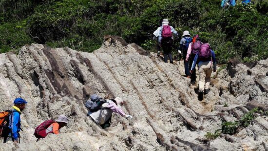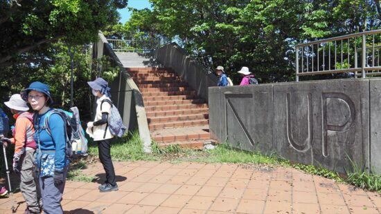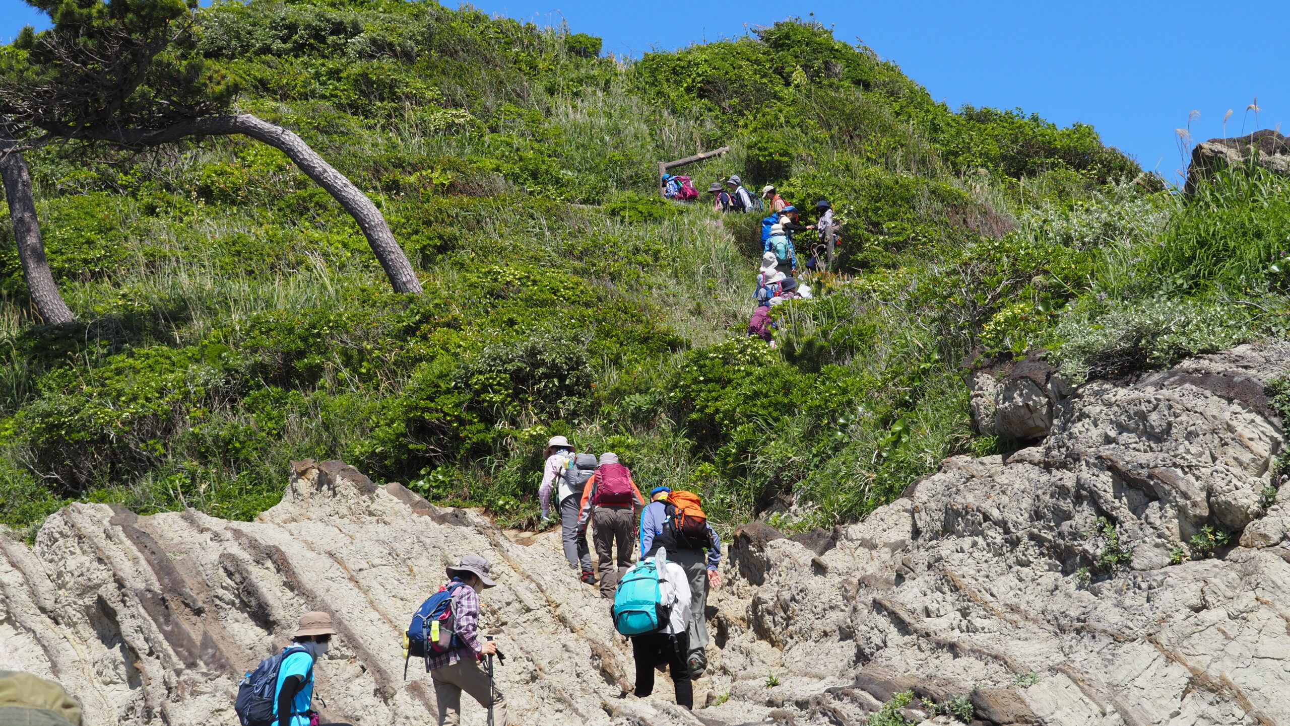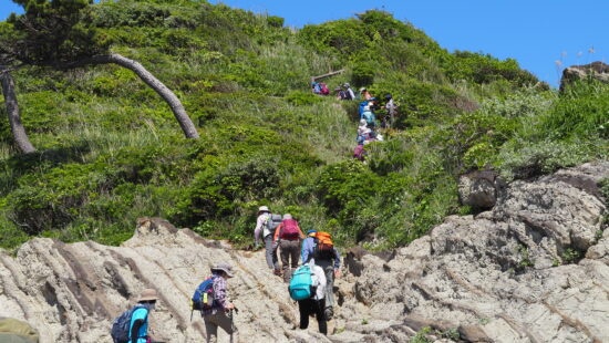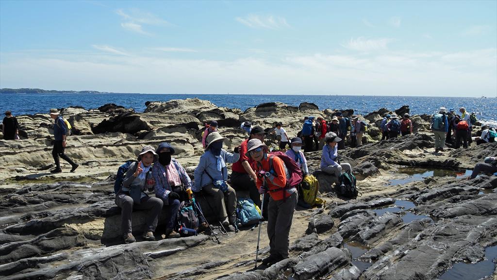 夕日の丘から岩礁帯に下り、潮風の丘から弁天島近くまで行き、その先は通行止のため引き返しました。