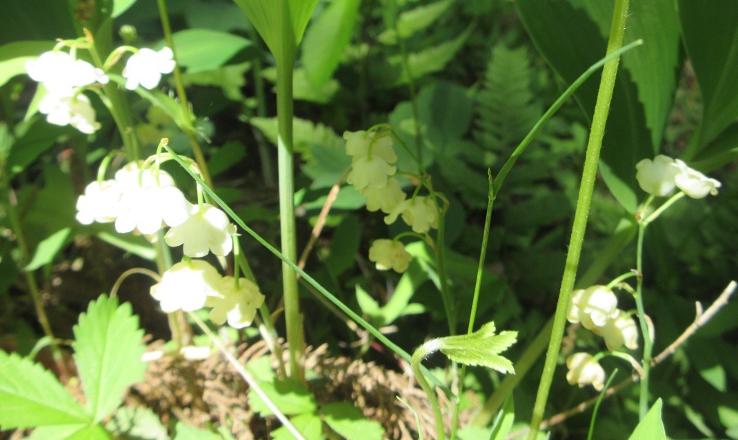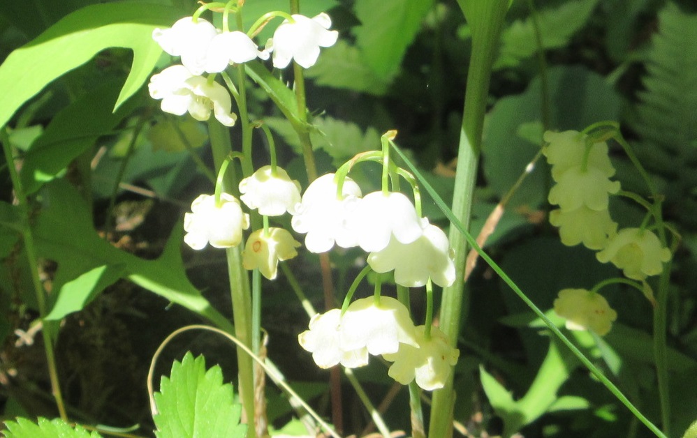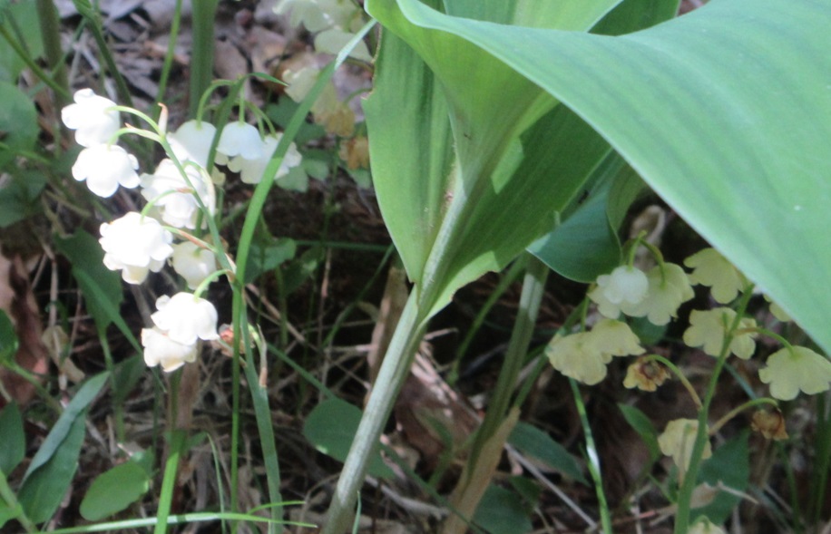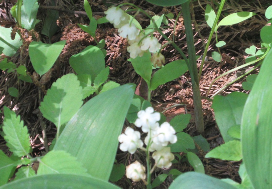 ケモノ除けの電気の柵に囲われてしまい、中には入れないですが、外で咲いているスズランがありました。