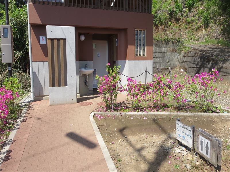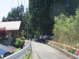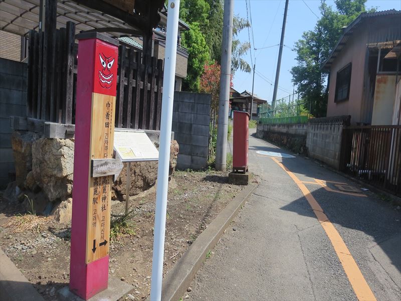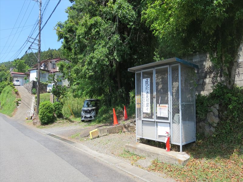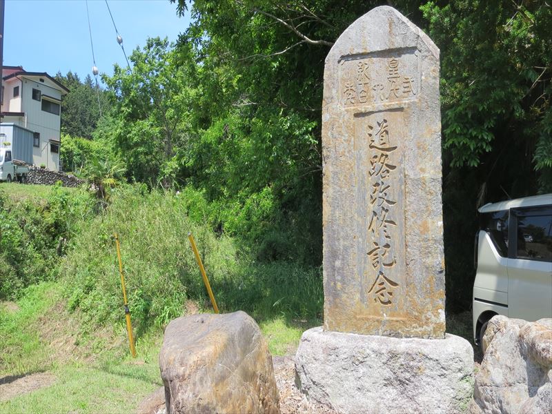 駅から約25分歩くと左に「道路改修記念」の碑と右のゴミステーションの間から入る。