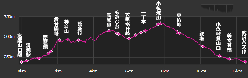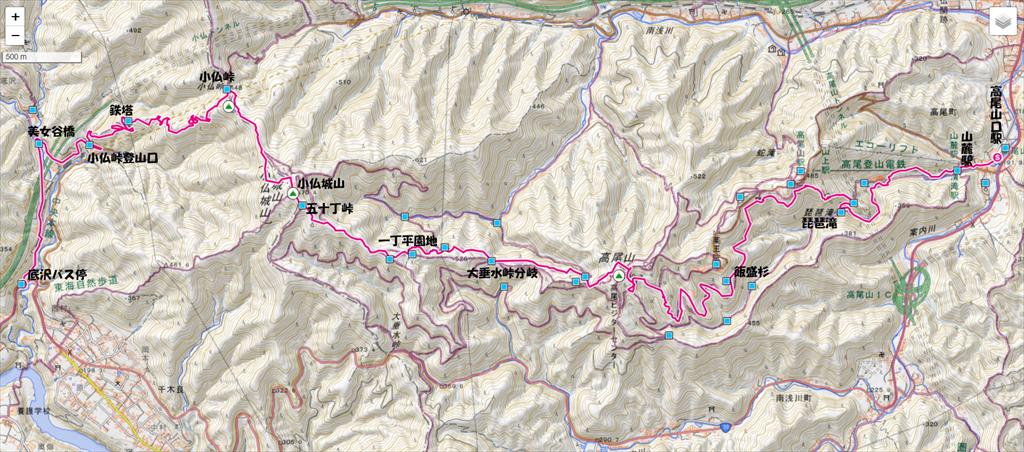 京王線高尾山口駅9:13→琵琶滝9:45→2号路→3号路→高尾山584m地点11:35→12:07一丁平(昼食)12:41→小仏城山13:20→小仏峠13:49→美女谷橋14:36→14:46底沢バス停=JR相模湖駅