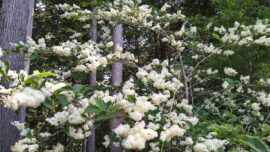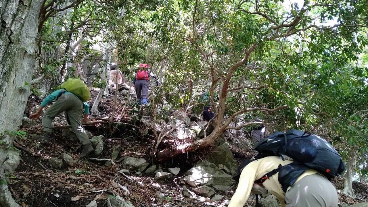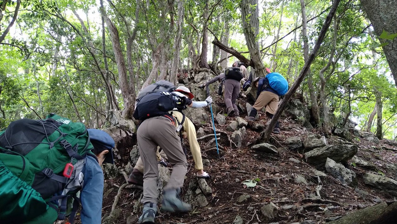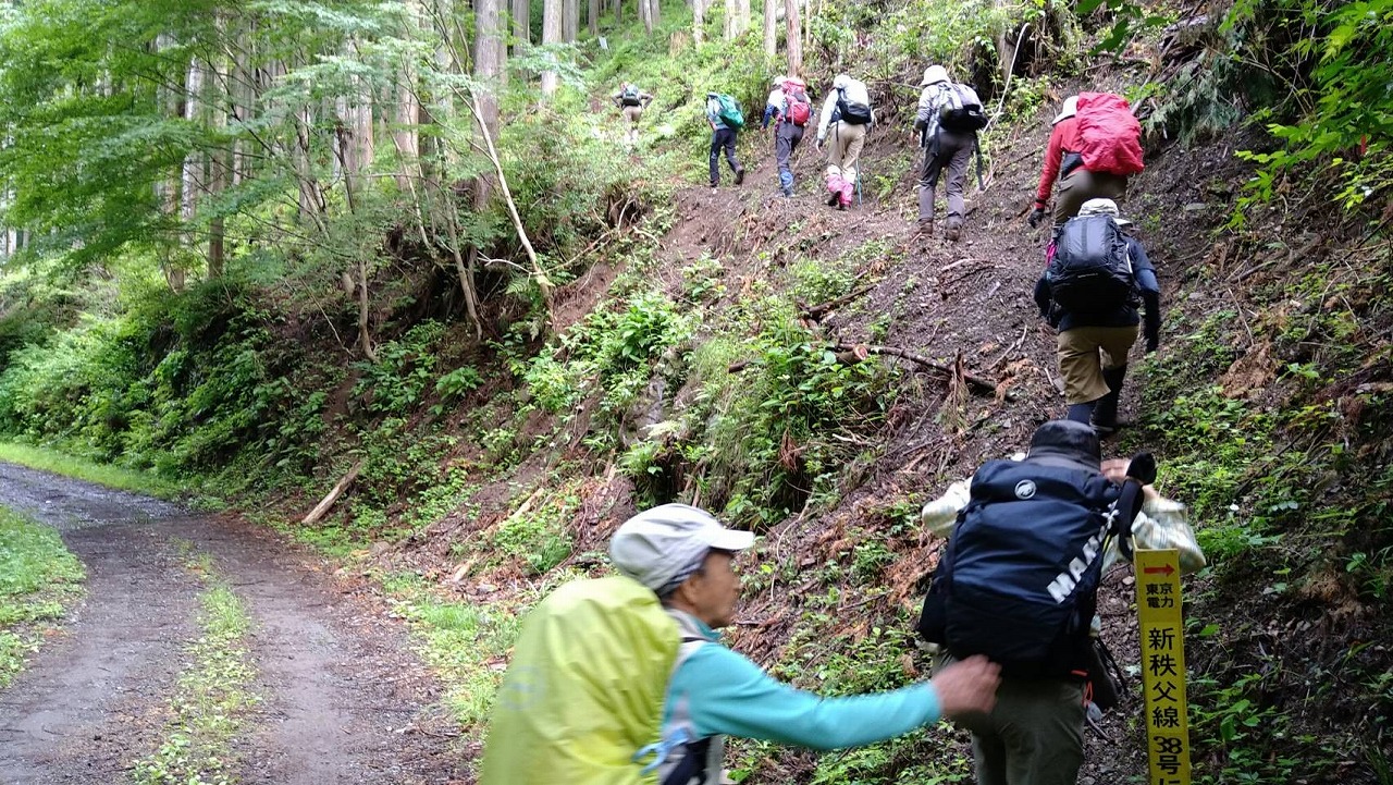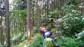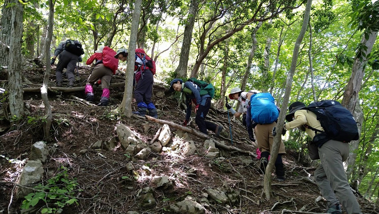 「下見は4月の末、いつもならアカヤシオやミツバツツジがまだある頃ですが、今年は上部に少しあっただけ。登山道は積もる落ち葉や乾ききった状態で歩き辛い感がいっぱい。これは大変!雨で中止!の筋書きも期待しましたが、当日は晴れてしまいました。幸い本番は前日までの雨で適度な湿りの道は良好、参加者の足並みも抜群に揃って快適な登りです。長いと感じた下りもみんなの明るいお話と沢山のガクウツギの花々に迎えられ素晴らしいものとなりました。