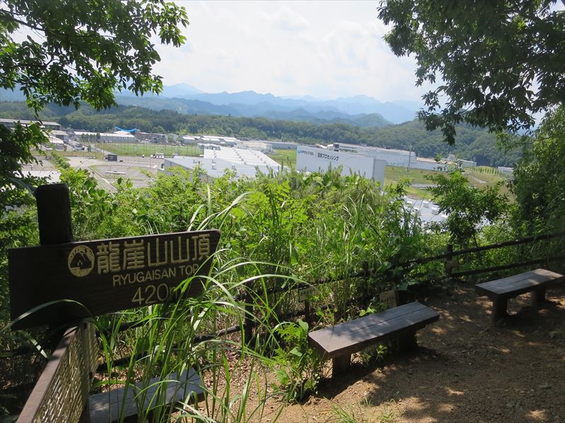 柏木山 中央の建物群が工業団地、その右を抜けた左側丘陵が「龍崖山」