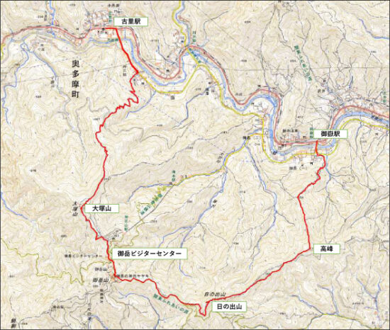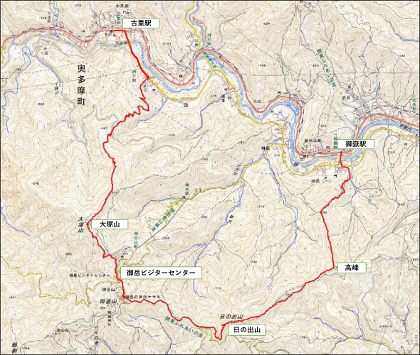 ▼コース : 古里駅前 09:07 – 09:21 大塚山登山口 – 11:55 中ノ棒山 – 11:23 大塚山(昼食) 11:50 – 12:15 御岳ビジターセンター – 13:00 東雲荘 – 13:10 日の出山 – 14:00 高峰 – 14:28 ラニヘッドトレイル – 15:07 御嶽駅