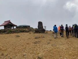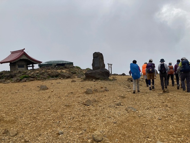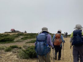 1日は山開きで強風と雨の中、八合目からの登山者が続々と小屋に立ち寄っては山頂へと出て行った。皆様すごいですね! 我々も6時に小屋を出たが強風で前に進まず小屋に引き返し10時迄待機し下山する。2日も雨予報だったので宿をキャンセルし一日繰り上げて山行を終えた。