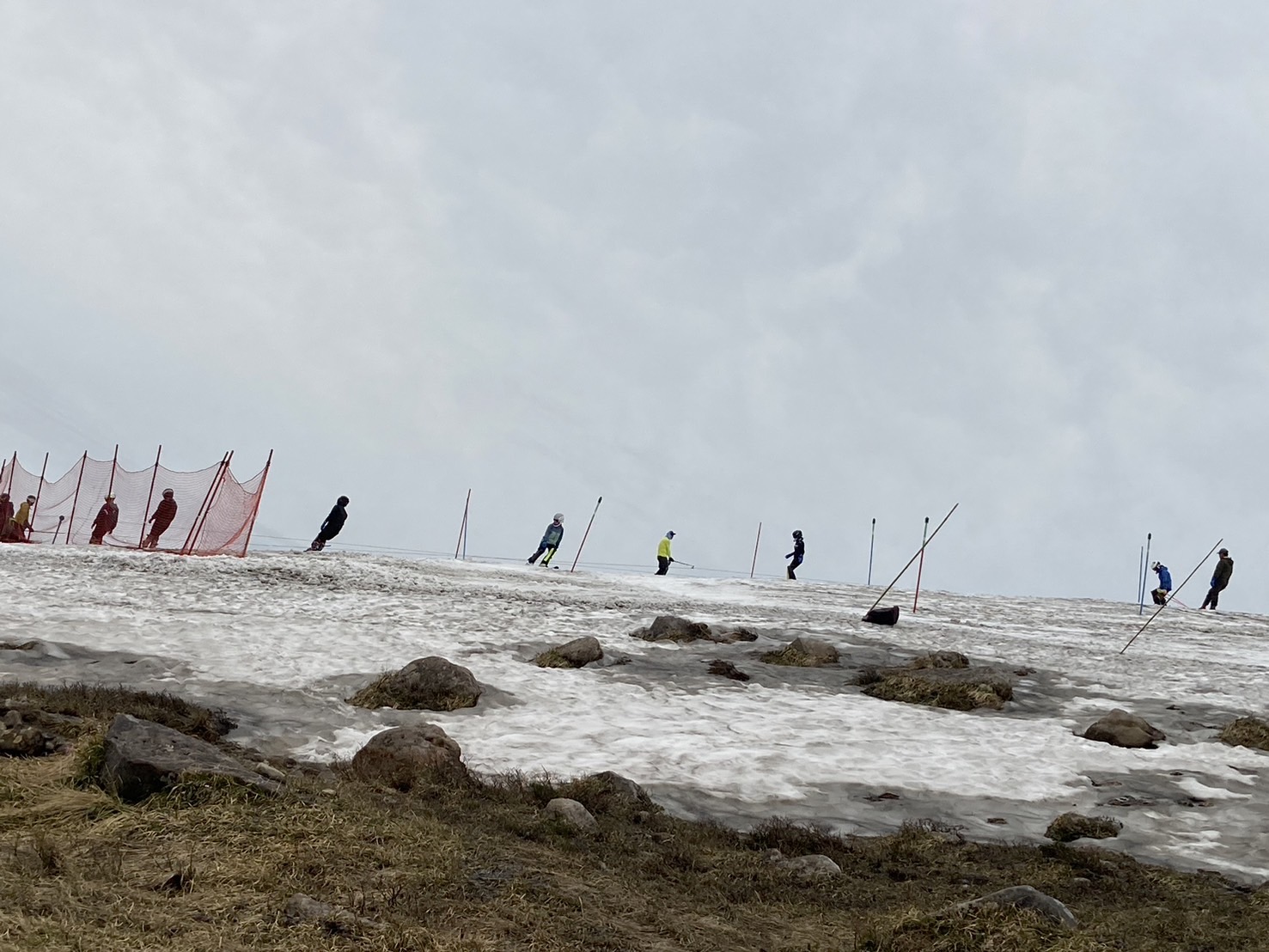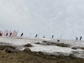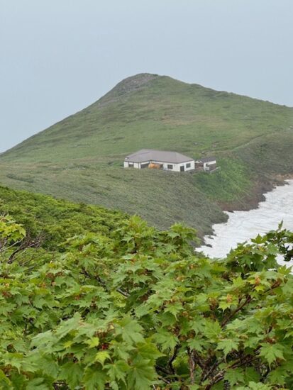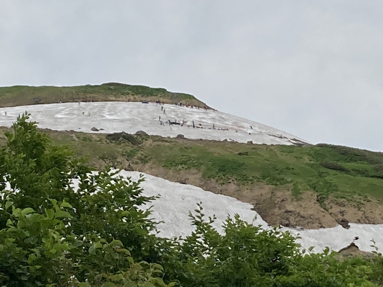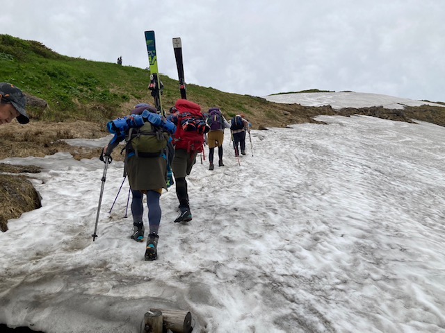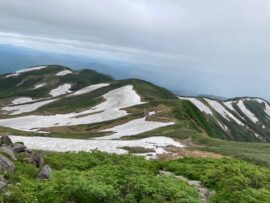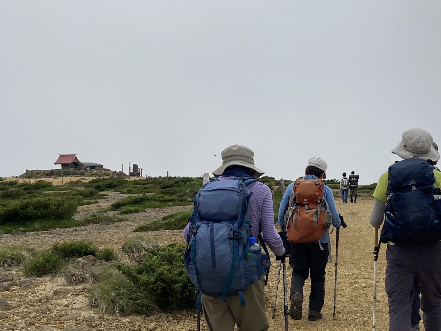 30日は湯殿山朝参りをしてから姥沢へ。リフトを降りると最後の春スキーを楽しんむ若者で賑わってた。我々はその横を直登して姥ケ岳経由しで月山山頂を目指す。2回の雪のトラバースもノーアイゼンで通過。山頂近くで雨が降り出し本降りになる。山頂小屋で昼ご飯を済ませて今日お世話に佛生池小屋までひたすら歩く。夜は台風並みの強風で中々眠れない一夜だった。