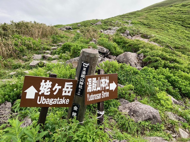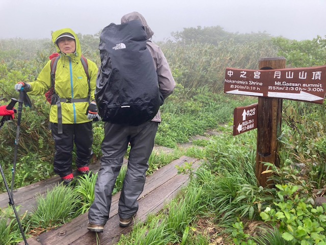 6月30日(日) 天気:曇のち雨 宿6:00 → 湯殿山朝参り = 宿(朝食) = 月山リフト下駅9:24 → リフト上駅9:47 → 姥ケ岳10:38 → 頂上小屋12:46(昼食) → 月山神社