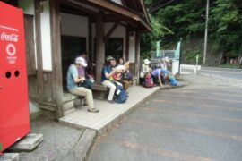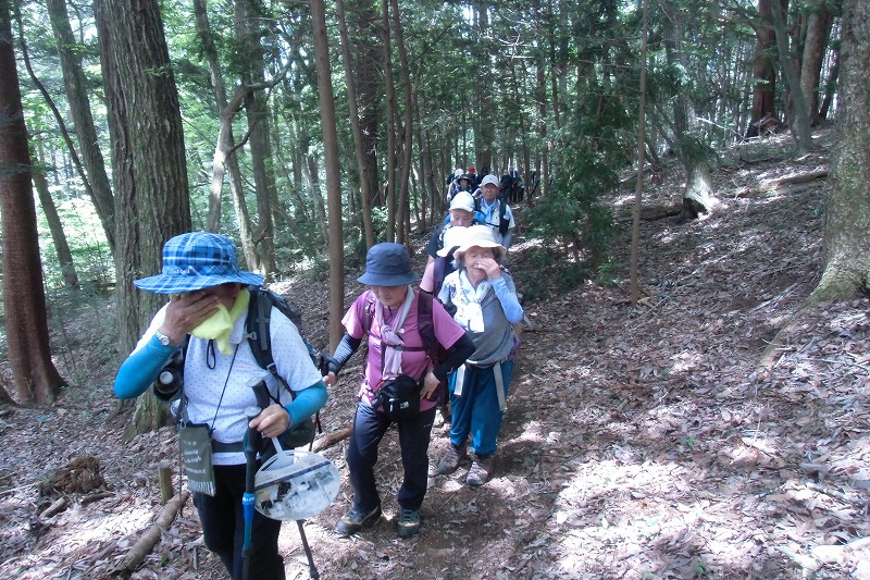 どんよりとまとわりつくような暑さの中大勢の方に参加頂きありがとうございます。登山口から里山風景を見ながら静かに1時間程ムッと息の詰まるような暑さの中辛抱強く我慢の登りでした。尾根道からは奥多摩の三頭山、御前山、大岳山などを見ながら少々風もとうり道々の石仏・代官屋敷跡などかつて交易で栄えた往時を偲ぶことができたと思います。皆様の協力で無事下山できました。お疲れ様でした。