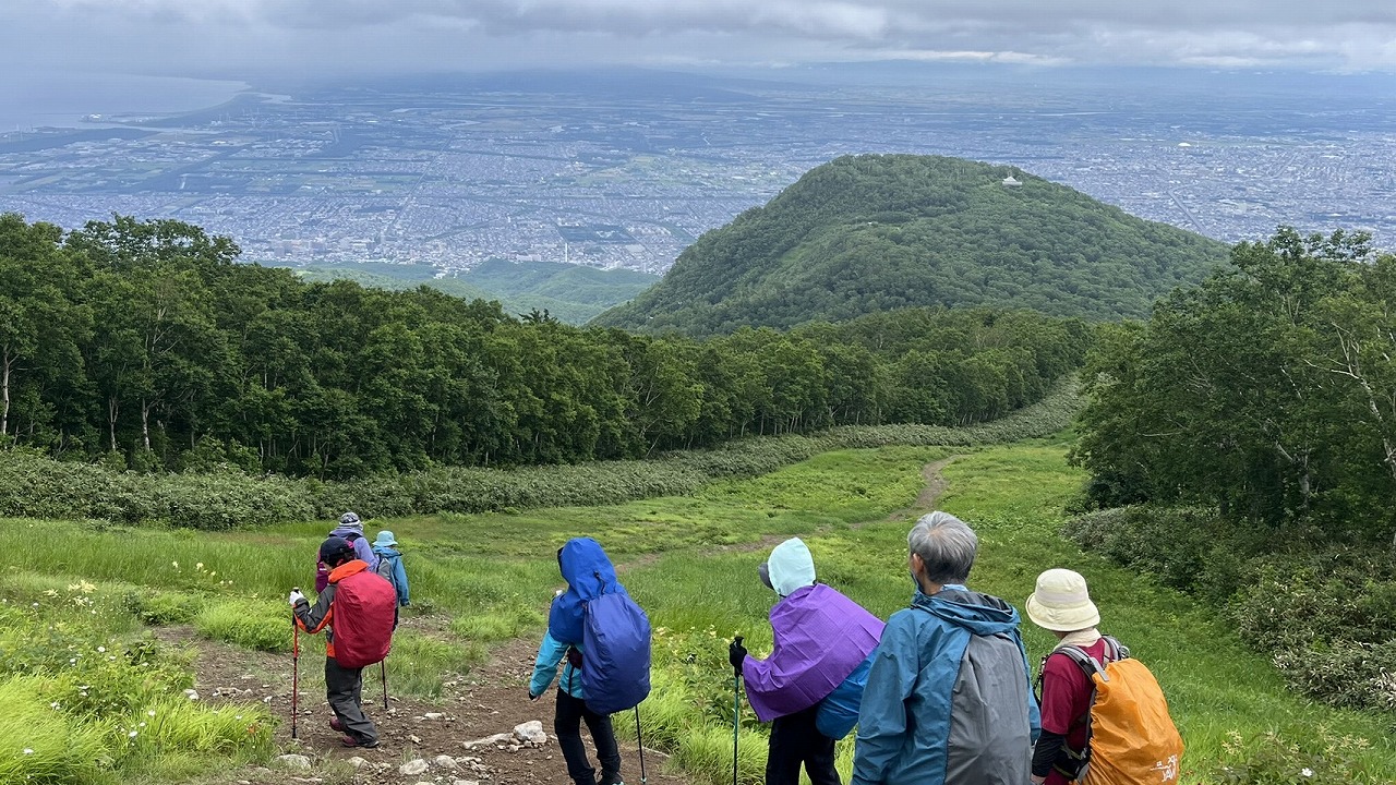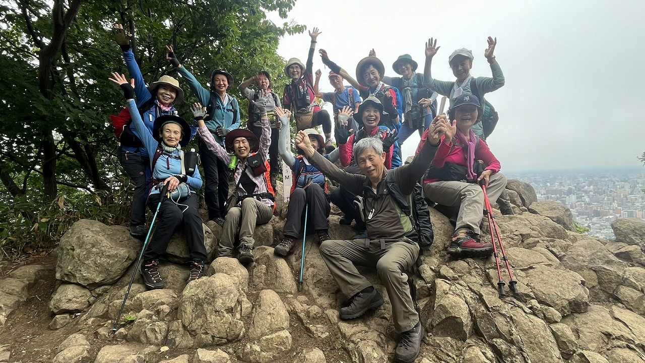 予報では早めの降雨が予想されるため、行先を手稲山に変更。沢沿いからガレ場を登るコースは変化があって面白い。スキー場下山時には晴れてステキな花と小樽の眺望を楽しみながら、そして降りた途端の雨のザーザー降りには自分達のの強運に一同ニコニコです。