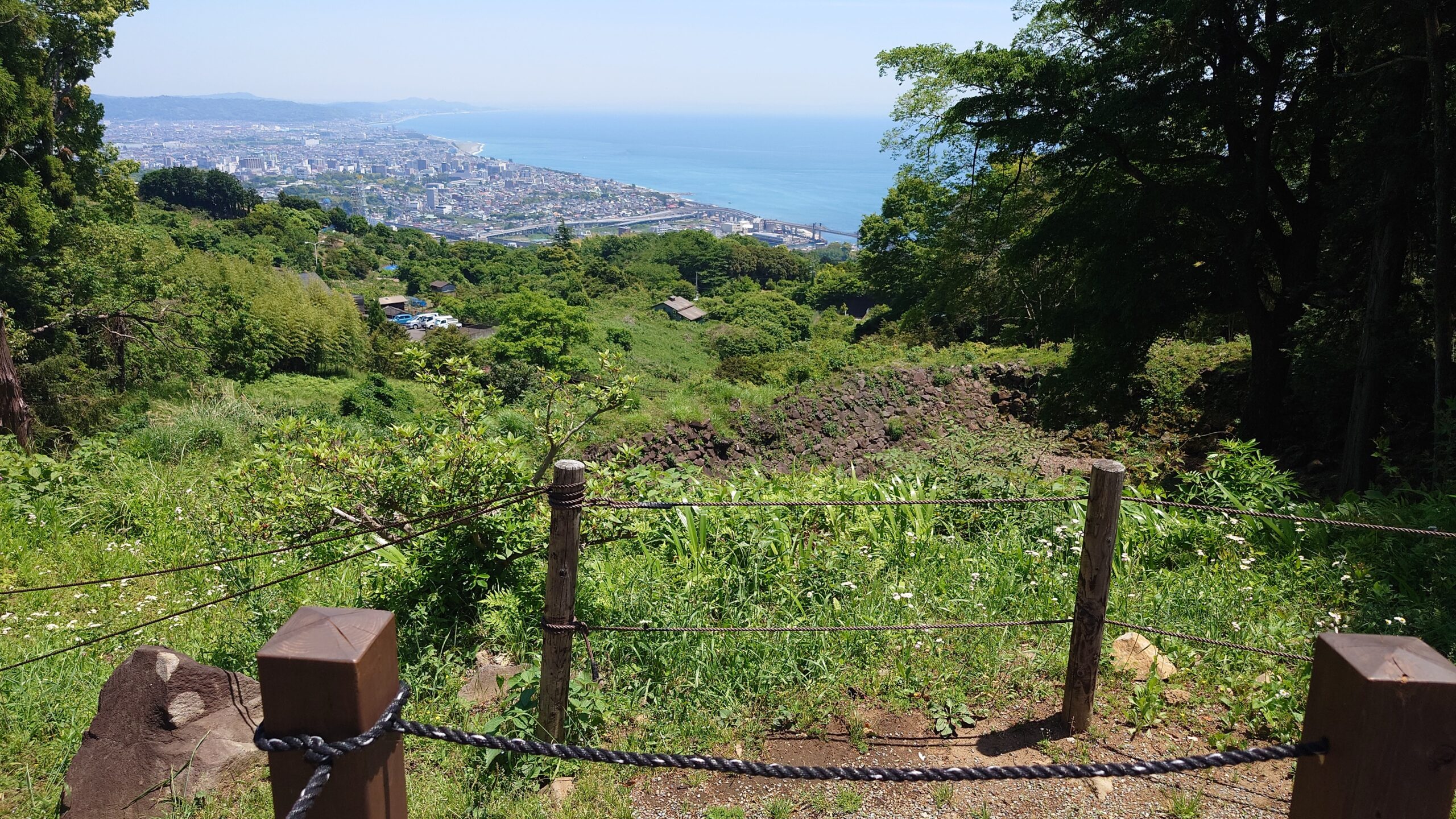 奥が石垣山。その東側(手前)は「ヨロイズカ」と駐車場と相模湾を見下ろせる休憩所 ❔