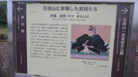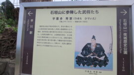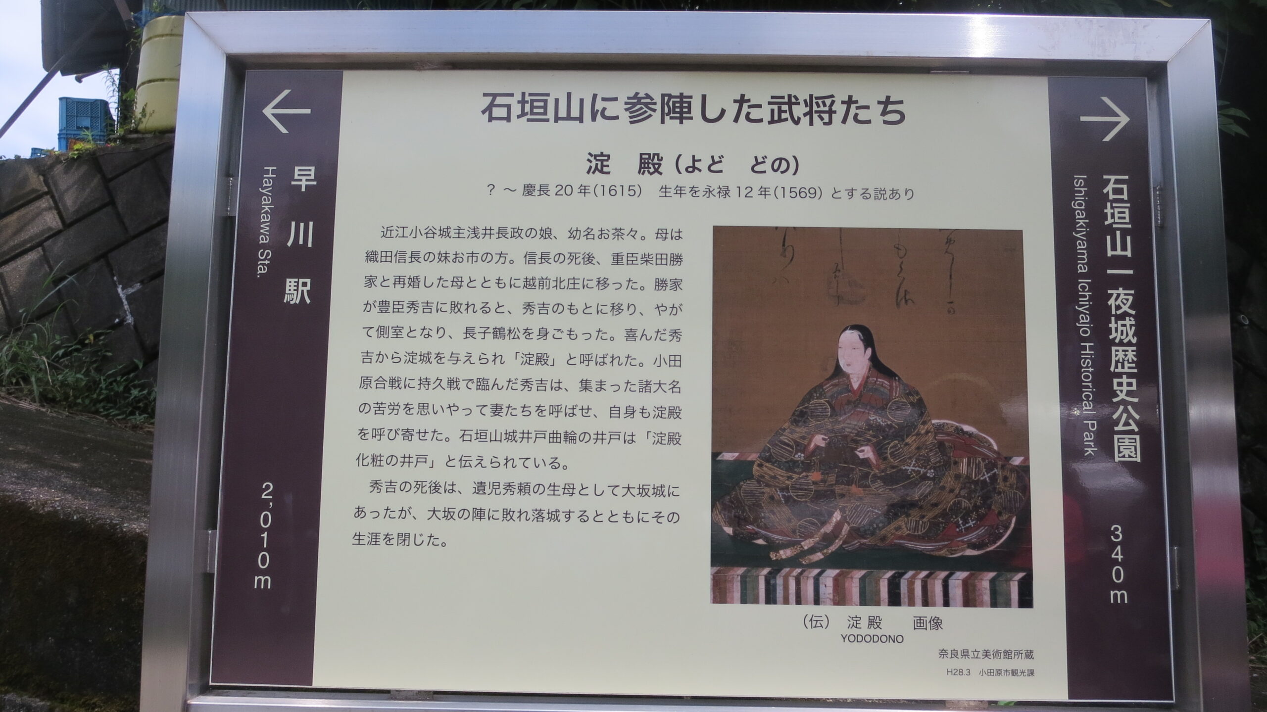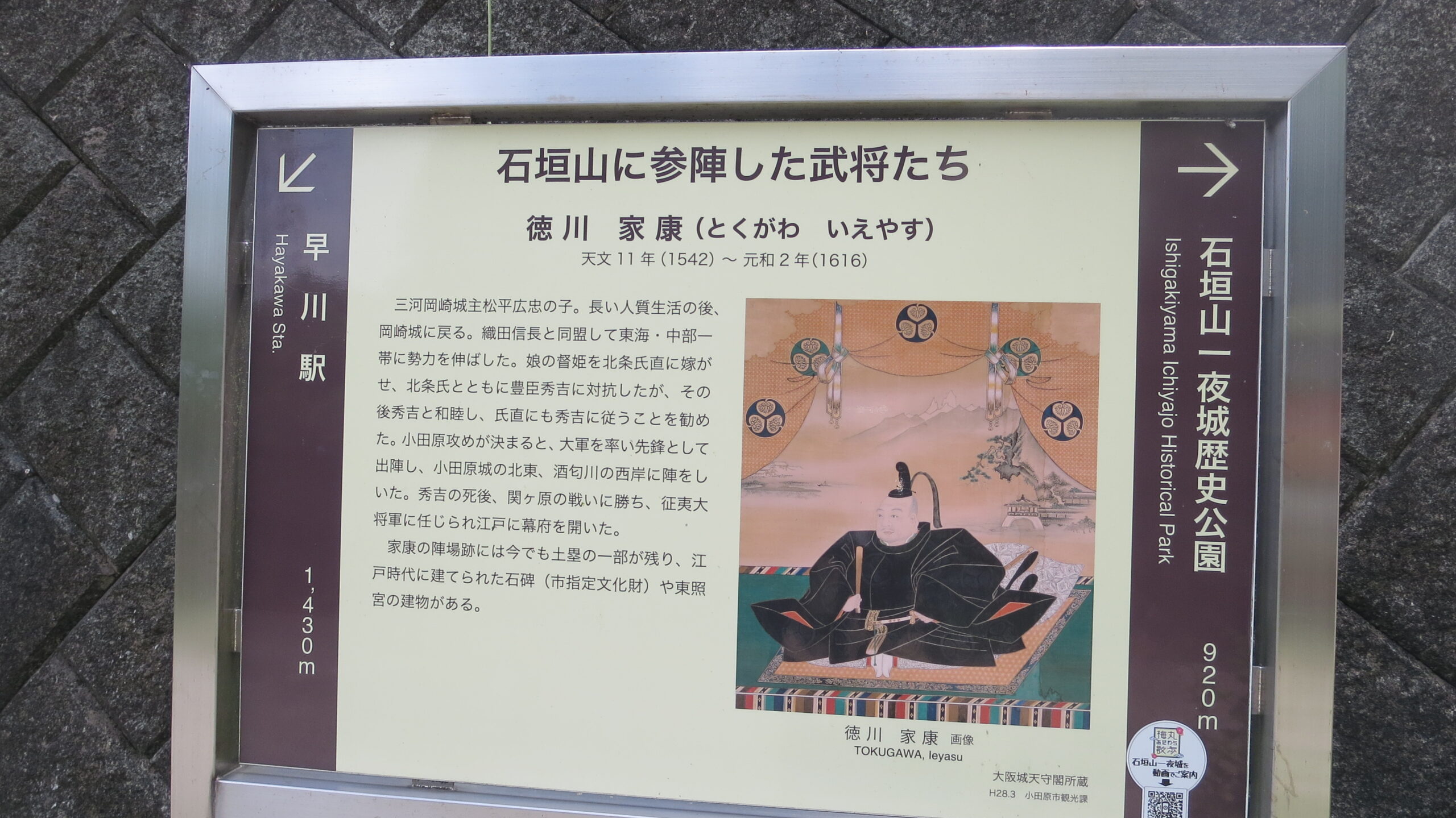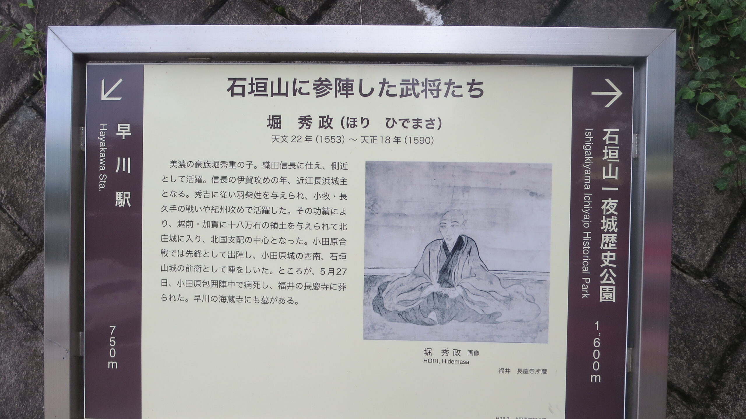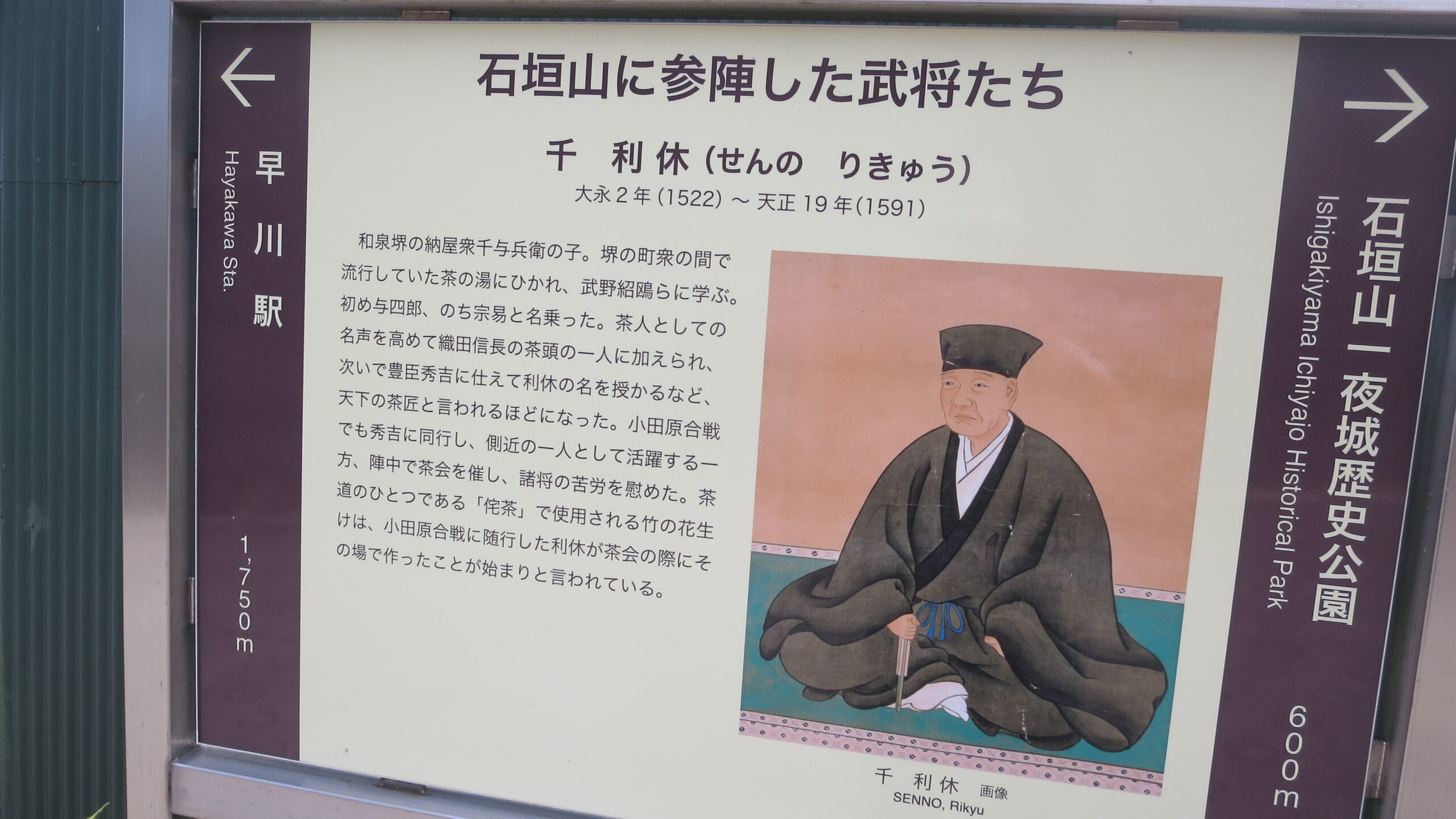 早川、小田原に下る道沿いに「小田原城攻めに参陣した武将の陣跡」の説明が。武将以外も参陣 ❔
