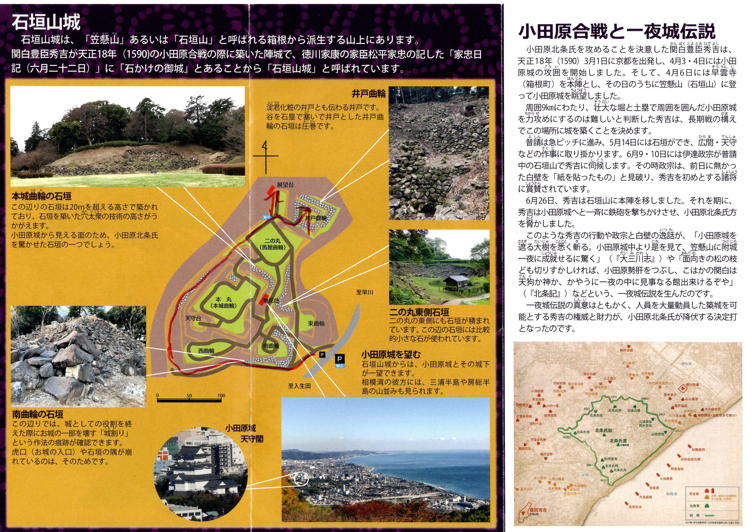 石垣山 南曲輪の石垣 本来は「笠懸山」と呼ばれていたが、天正18年(1590)豊臣秀吉が戦国時代最大と言われる小田原城北条氏を水陸15万人の大軍を率いて包囲し、その本陣として総石垣の城を築いたことから「石垣山」と呼ばれるようになった。この城が一夜城と呼ばれるのは、秀吉が築城にあたり、山頂の林の中に塀や櫓の骨組みを造り、白紙を張って白壁のように見せかけ、一夜のうちに周囲の樹木を伐採し、それを見た小田原城中の将兵が驚き士気を失ったためと言われています。と小田原市の「石垣山一夜城」の説明がありました。