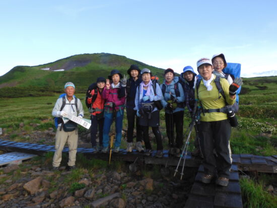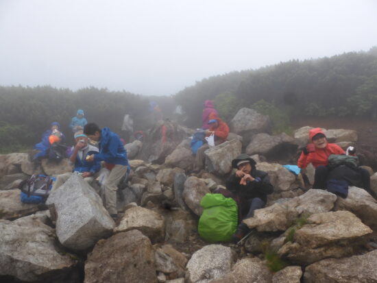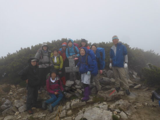 獅子岳山頂で集合写真 ガスてって展望望めず、この先急下降ザラ峠迄慎重に下りる