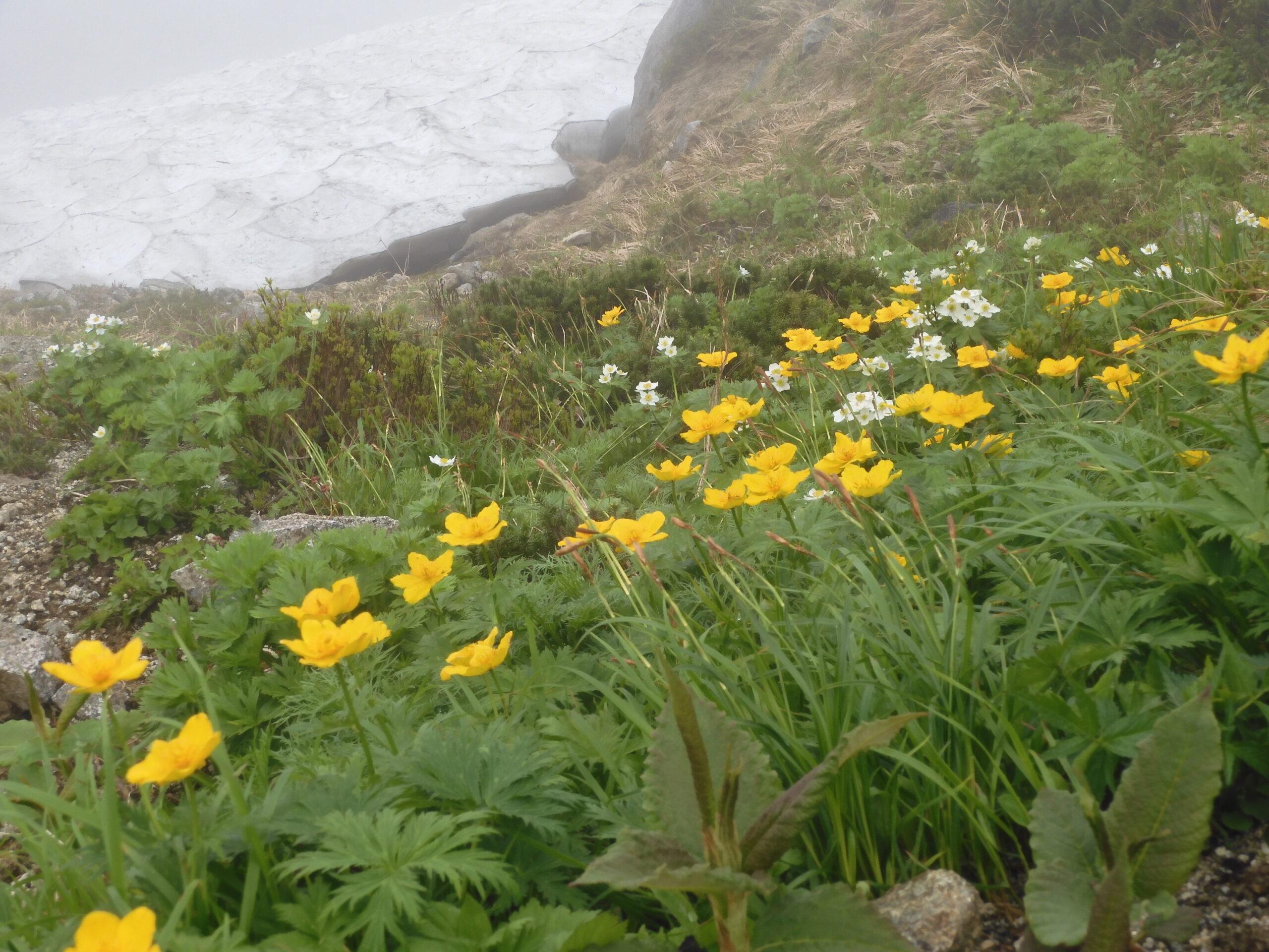 2日目は朝☀️の爽やかなうちに出発して緊張続きの岩、雪渓を踏み締めながら歩き見渡せばはくさんいちげ、きんぽうげ、イワカガミ等等、見事な花の饗宴に心を癒されました。登山は天候に左右されますがコースを変更し、新たな発見で黒部湖を周遊出来たのは良い思い出になりました。